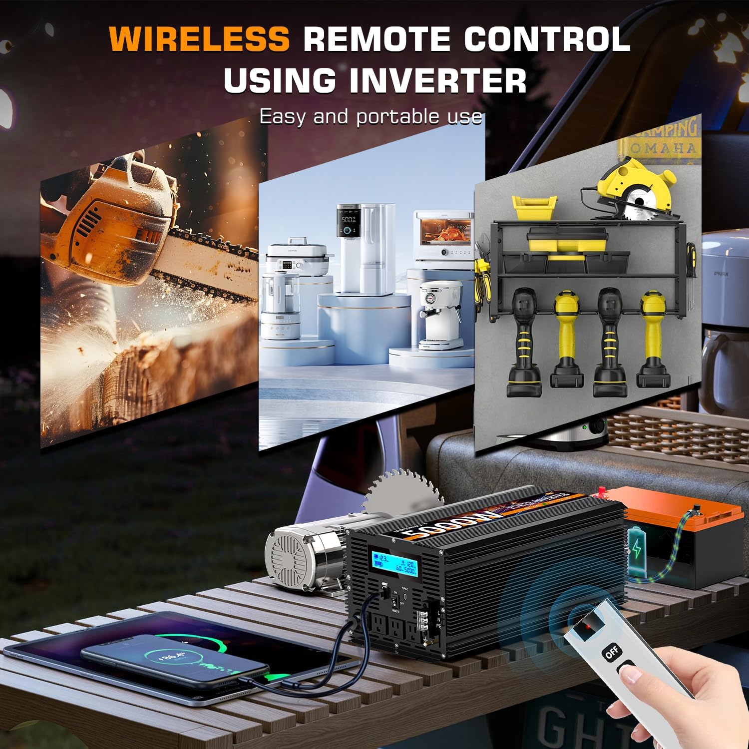 5000 Watt Power Inverter 12V DC to 110V 120V Converter for Family RV Off Grid Solar System Car with Type-C Ports 3 AC Power Outlets Dual USB Ports LCD Display Wireless Remote Control