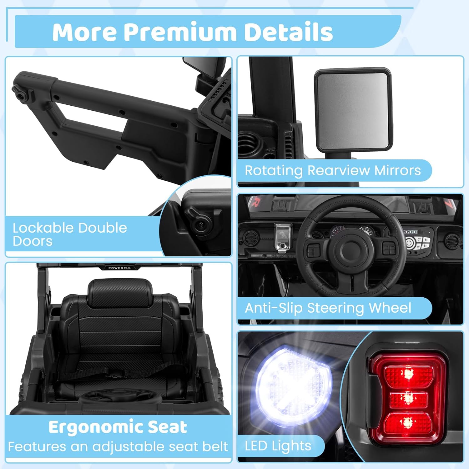 - For Realistic Adventure: The ride on car, ASTM compliant and CPSIA certificated, features more premium details, including LED lights, rotating rearview mirrors, and lockable double doors. Besides, it includes a battery display for monitoring playtime. Overall Dimensions: 41.5” x 26.5” x 27.5” (L x W x H), Load Capacity: 66 lbs.