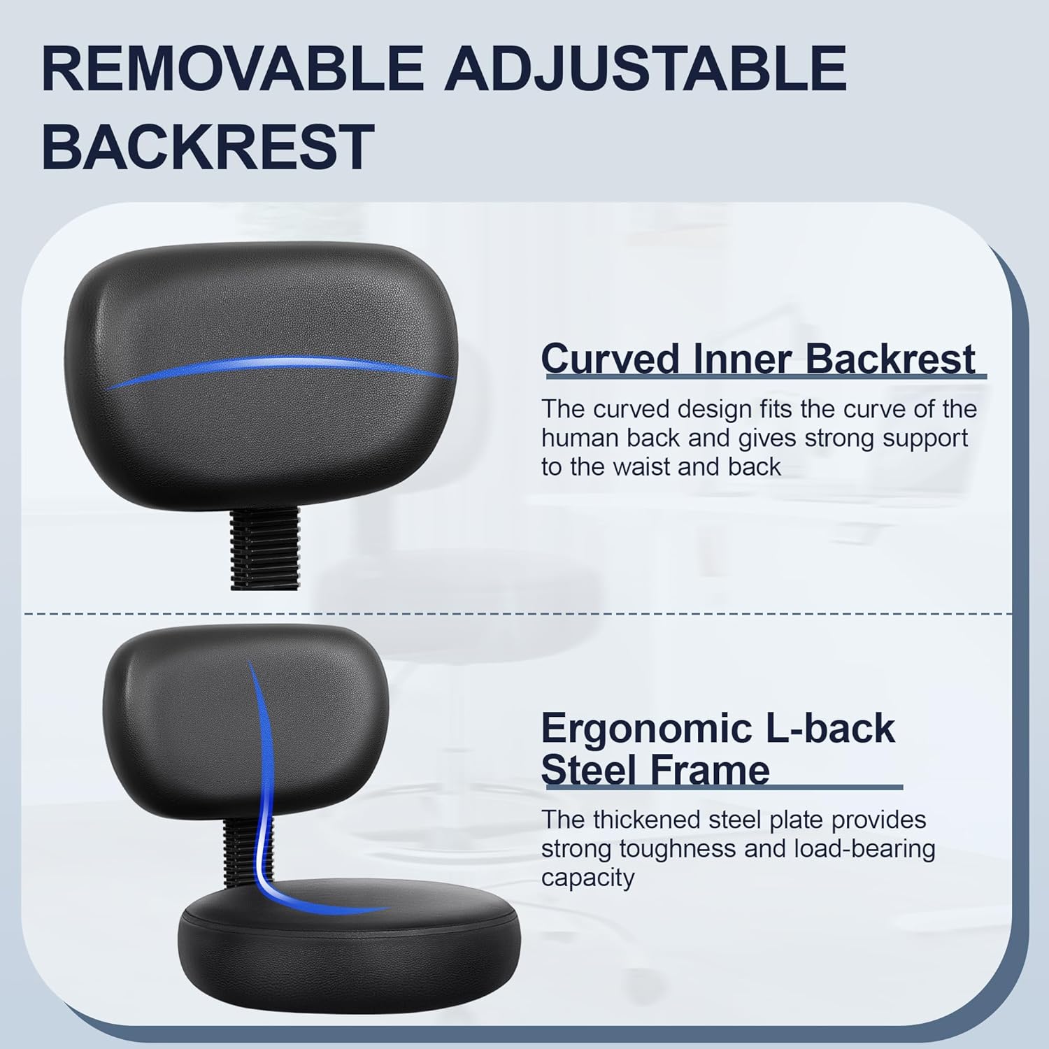 - Ergonomic Detachable Backrest: The PU leather backrest of this standing chair can be removed as needed. The curved backrest design is ergonomic. The thickened backrest steel plate provides strong toughness and load-bearing capacity