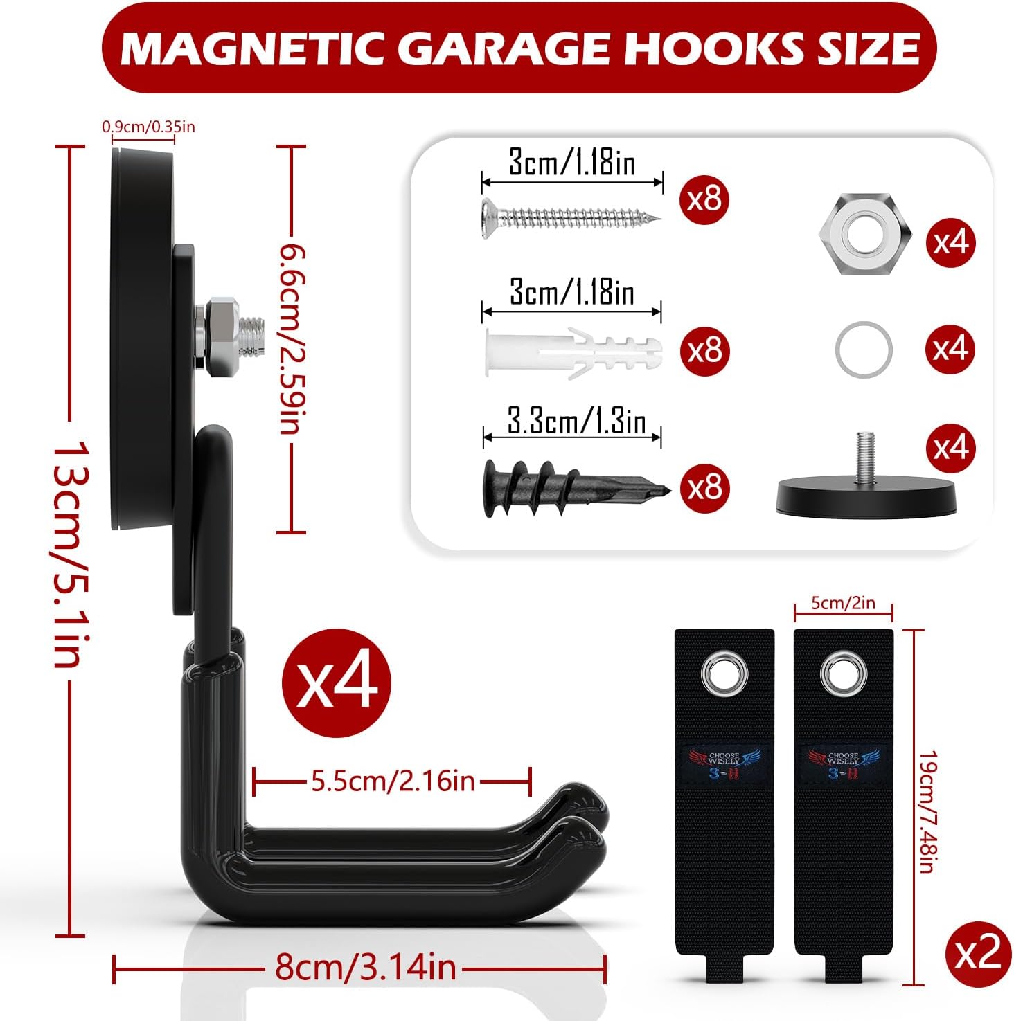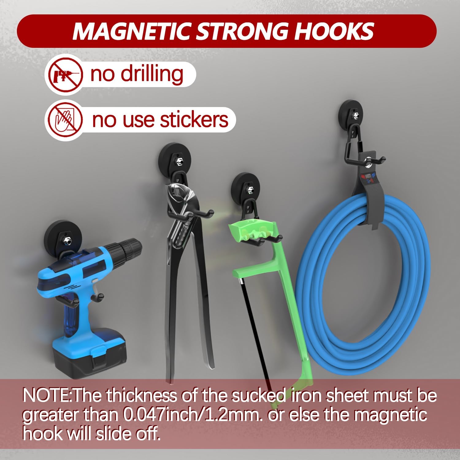 - Efficient Vertical Storage Solution: Discover the ultimate space-saving solution with our strong magnetic hooks. Versatile and reliable, these hooks are perfect for a multitude of environments, including garages, kitchens, offices, warehouses, gardens, and basements. These magnet hooks heavy duty help to reduce clutter and maximize available space, accommodating a variety of tools and equipment, including hoses, ropes, shovels, wires, cables, rakes, and more