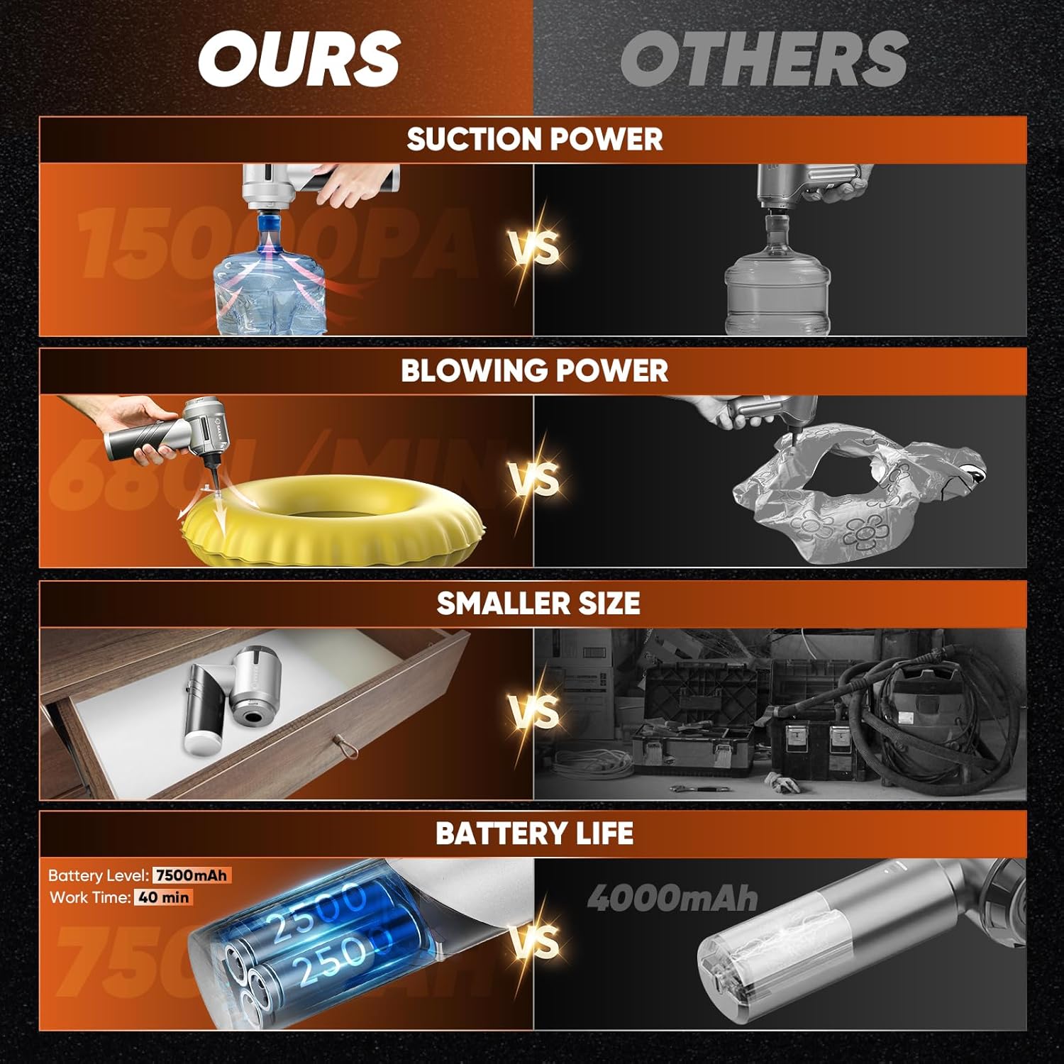 - 【Practical accessories】The included extension tube can easily clean hard-to-reach corners, and the sleeve with a brush can easily remove stubborn dust in the gaps. With the blowing accessory set, you can quickly inflate the swimming ring and kayak, and you can also help with combustion in outdoor barbecues, help carpenters blow away sawdust, and vacuum storage bags. Rich accessories can make your life more convenient.This set is also suitable as a Father's Day gift.