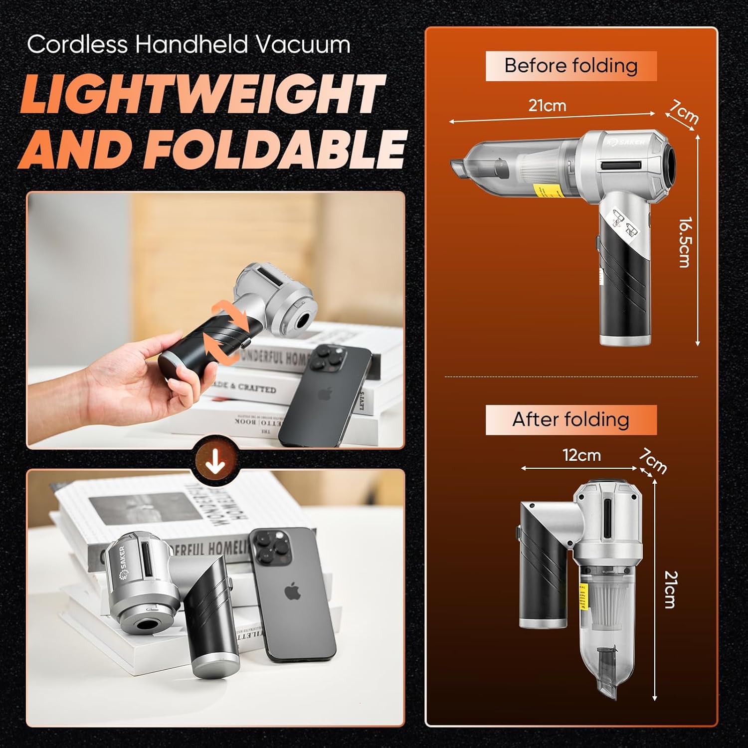 - 【Lightweight and Portable】Saker fold-able vacuum cleaner is compact, only 380g, wireless use is not limited by space, and it can be rotated and folded. After folding, it is only as big as the palm, which can be more convenient to carry and store.