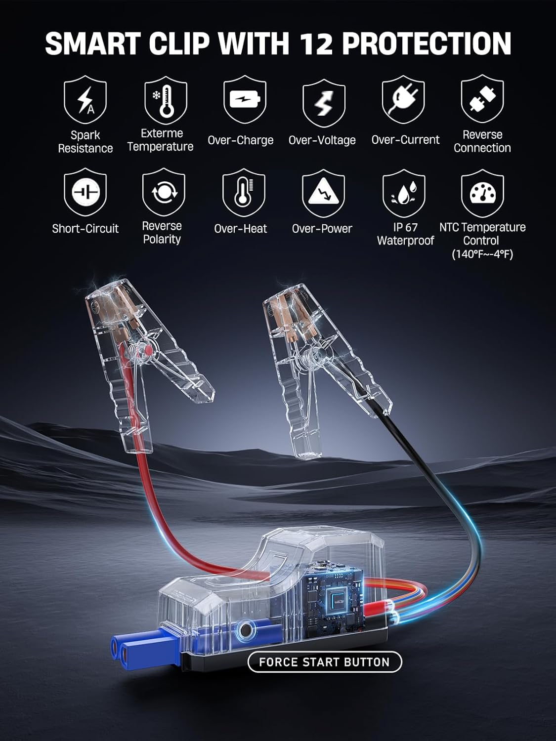 - 【𝐏𝐎𝐖𝐄𝐑𝐅𝐔𝐋 𝐂𝐀𝐑 𝐉𝐔𝐌𝐏 𝐒𝐓𝐀𝐑𝐓𝐄𝐑】ANFLAG BD50 car battery jump starter pack has 5500A peak ultra-high current, especially for vehicles up to All gas/12.0L diesel engine. With 𝐅𝐨𝐫𝐜𝐞 𝐒𝐭𝐚𝐫𝐭 𝐟𝐮𝐧𝐜𝐭𝐢𝐨𝐧, this car battery booster pack can instantly start your completely dead or low-voltage car batteries, even extreme weather conditions ranging from -4°F to 140°F. Powerful and safe, you can start your car with complete peace of mind!