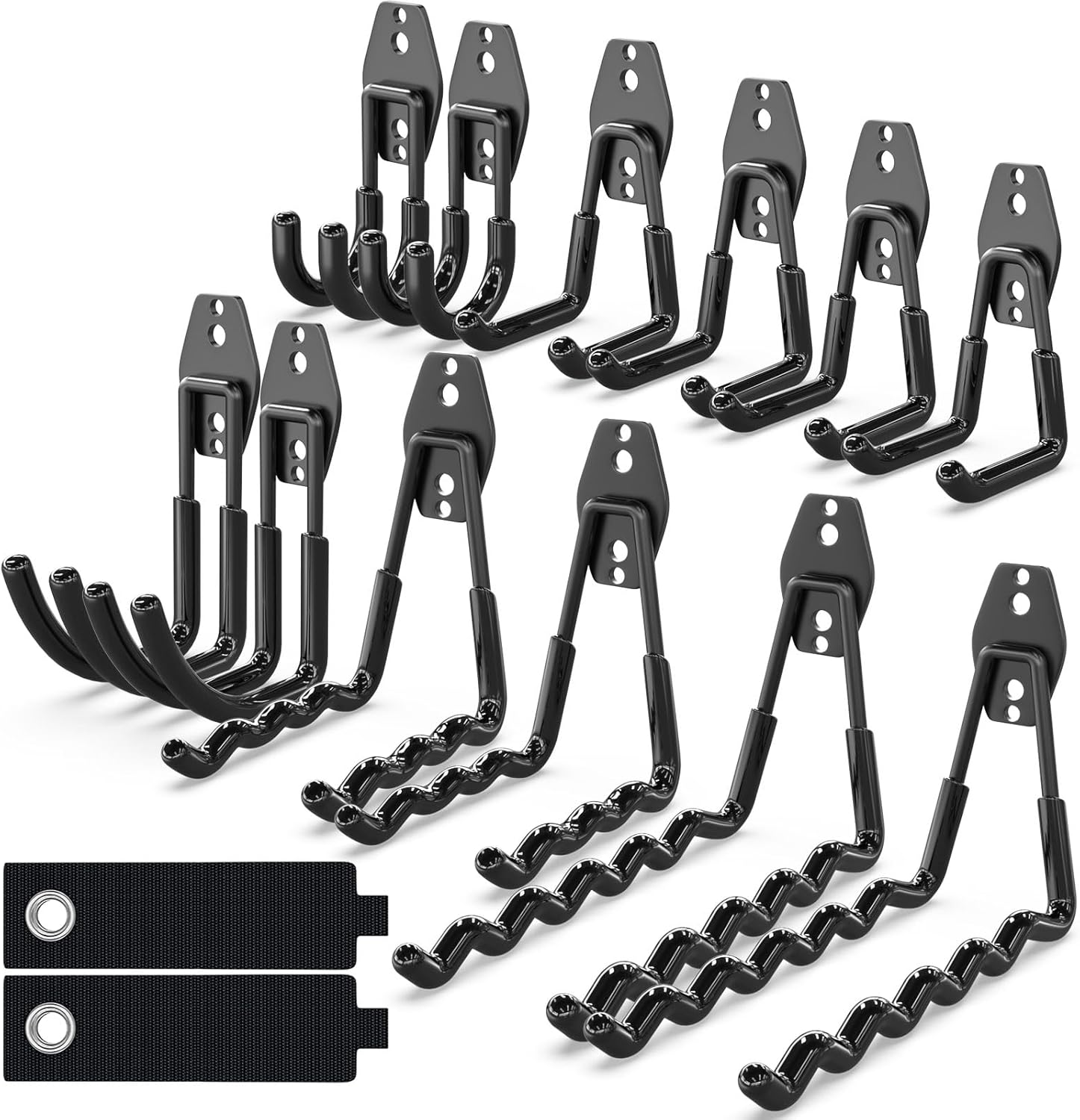 - PRACTICAL GARAGE ORGANIZER: The wall mount hooks set come with 2 large Wave Hooks, 2 Media Wave wall hooks,4 small U garage wall hangers,2 Media J ladder hook,2 Small J hooks for garage,2 Large Size Extension Cord Organizer for Garage Organization and Storage You can use the garage organizer to hang garden tools, power tools, ladders, bikes,Garden Hose, shovel, broom, kayak, scooter, weed eater, or bulk items.