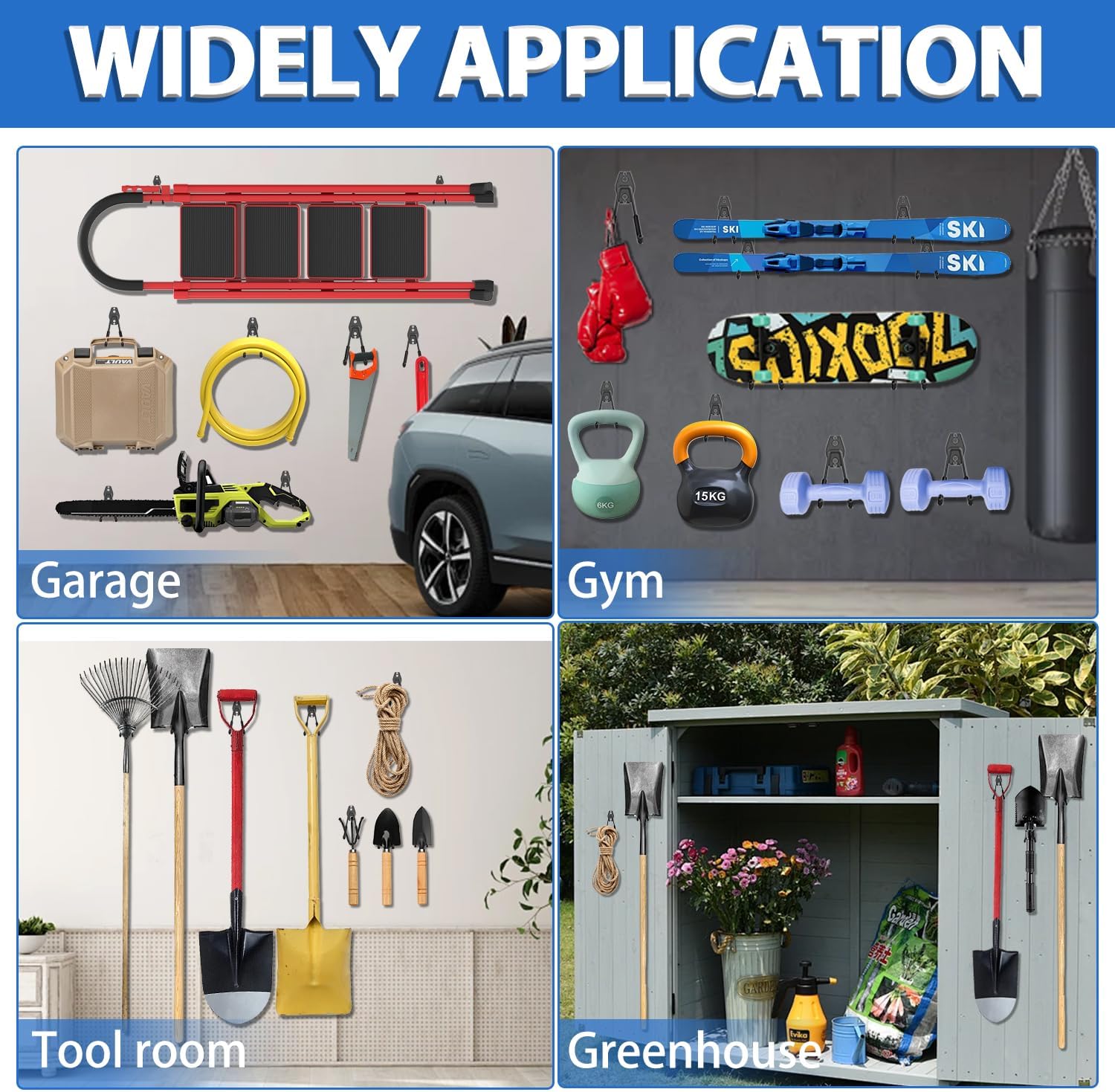 - UTILITY HOOKS:The hooks for hanging heavy duty maximize space and eliminate garage room clutter,giving your garden warehouse a beautiful look. The garden tool organizer are also ideal for garage,shop,basement,shed etc. garage hooks is an awesome gift for electricians, DIYers, fathers, husbands,craftsman for home organizing or housewarming