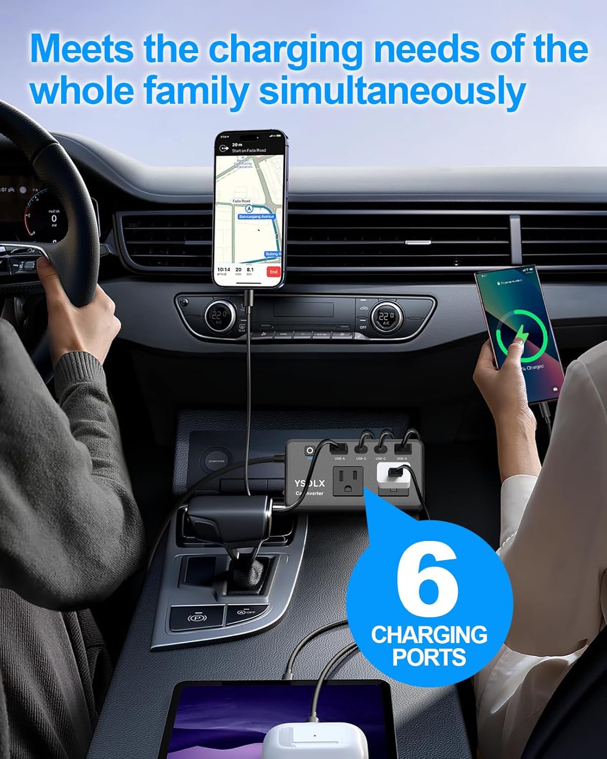 - Portable Power Inverters For Vehicles: equipped with 4 USB-C/A 24W charging ports and Double 110V AC car outlet adapter to wall plug, providing ample power for smartphones, cameras, laptop, breast pump, nebulizer, game console, kindle, TV, DVD players, or other devices, ensuring that your devices are fully charged and ready to use during travel