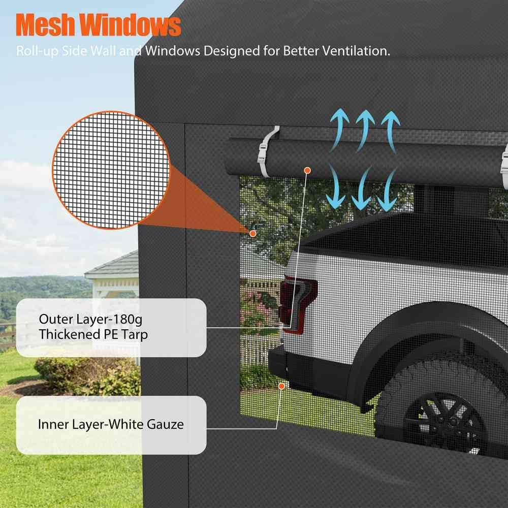 - 【Removable Sidewalls Window and Doors】This carport shelter has 2 removable sidewalls with Roll-up Ventilation Windows. It can help with airflow, and prevent moisture. It also has two removable doors with zippers. You can roll the doors up or down as you wish. Or remove all the sidewalls and doors, only leave the canopy cover on for outdoor activities.