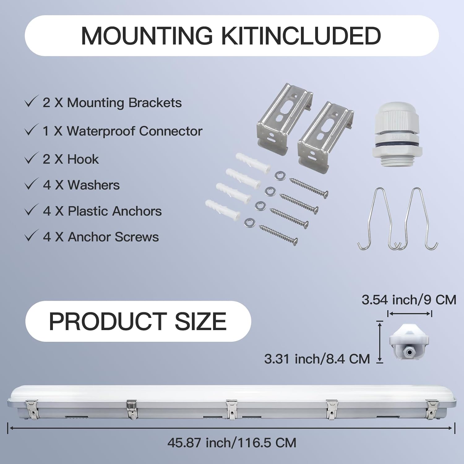 - 【Quick and Easy Installation】 Transform your space in just 3-5 minutes with our 4ft LED fixtures. Simply follow 3 easy steps to surface mount these hermetic fixtures. Mounting Bracket and screws included for Wall Surface Mount. There is also one cable gland provided for waterproof cable connection (Cable NOT included).