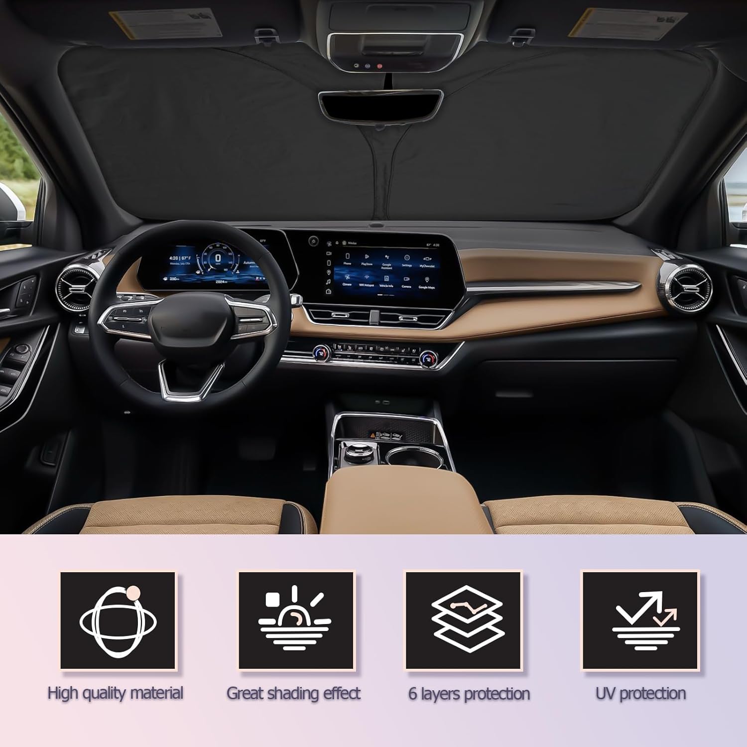 - 【High-quality Materials】This fit for 2025 Chevrolet Equinox windshield sun shade is made of premium 240T material, multilayer design. Not only block and reflect heat, but also blocks out harmful UV rays and sunlight. The two reinforced steel bezels also provide better durability and can be folded indefinitely, ensuring a longer and safer lifespan