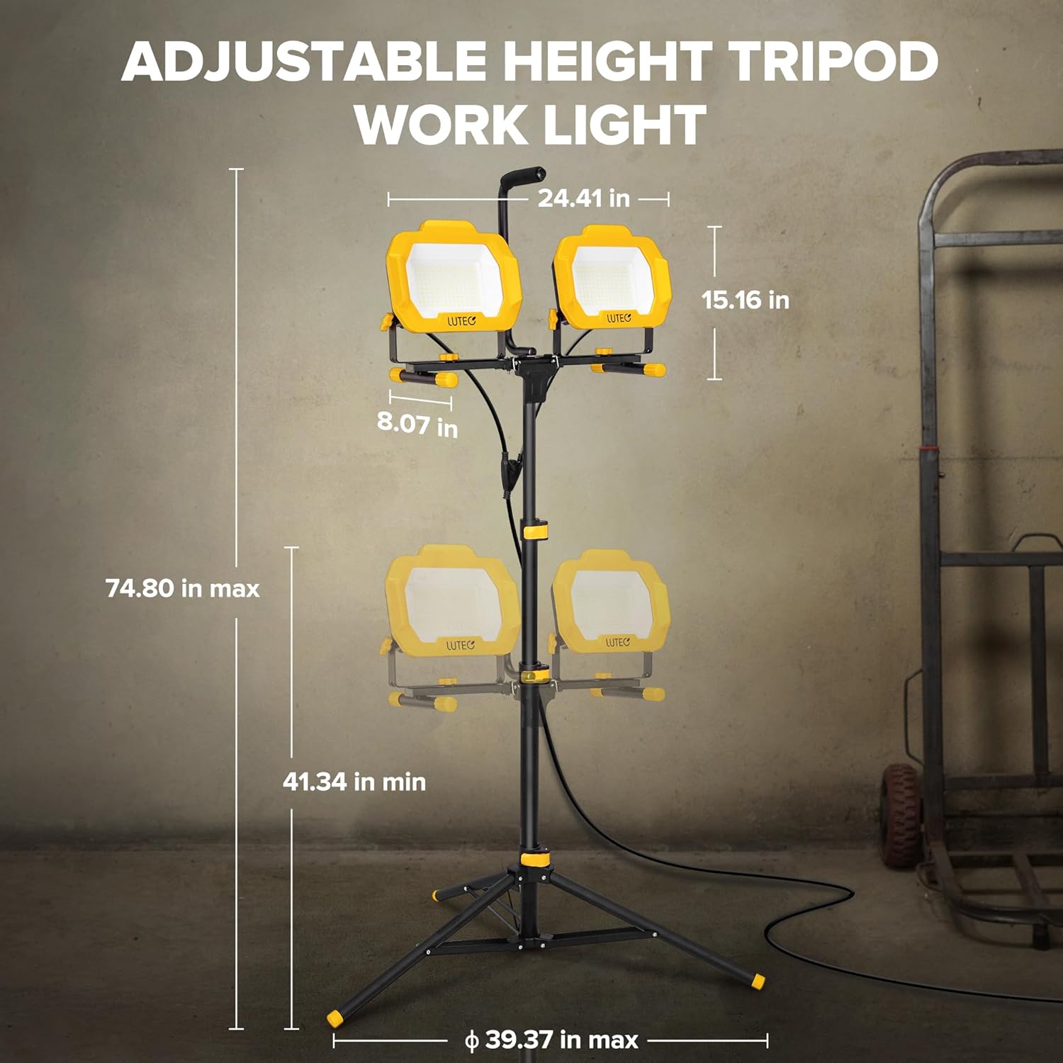LUTEC 25000 Lumen LED Work Lights with Stand, Dual Head Dimmable Work Light with 6 Brightness Levels, IP65 Waterproof Rotating WorkLights with Telescoping Tripod and 8.2 Ft 3-Prong Power Cord