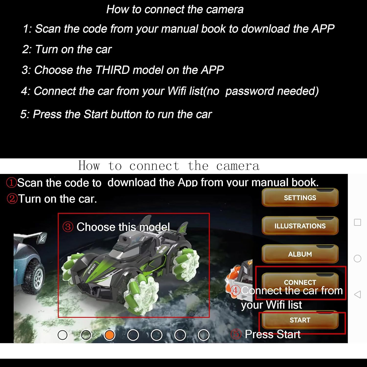 - Designed with Camera: This Drift car is designed with high-definition 720P camera, allowing for free photography and real-time recording experience different visual effects. Connect the device to your smartphone via the App and enjoy wonderful driving experience. You can download this app from the instructions.