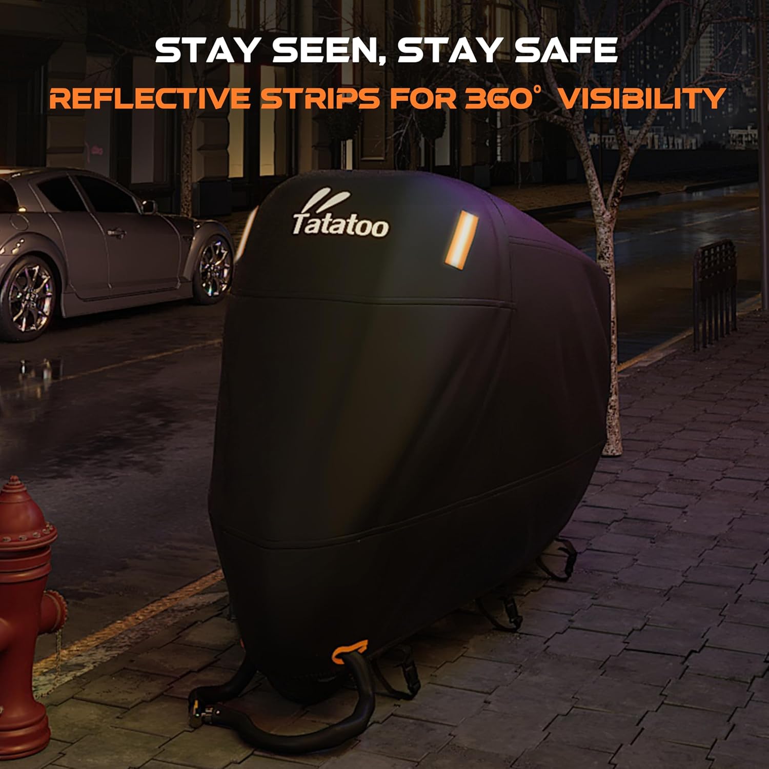 - UV Resistance & Windproof Secure Fit: The internal UV coating prevents paint fading and aging, making it a reliable motorcycle tarp for long-term sun exposure. Strategically placed windproof buckles (front, middle, rear) keep the large motorcycle cover firmly anchored, even in strong winds—ideal for scooter cover waterproof outdoor use.