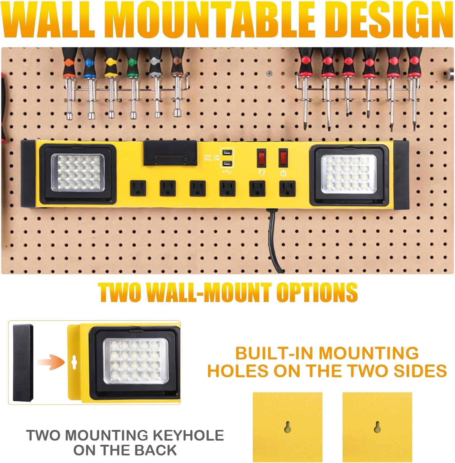 - Improve Efficiency with LED Lights: our power strip is equipped with built-in LED lights that providing ambient illumination, reducing the risk of accidents in low-light conditions; 2 LED Lights with 1000 Lumens and 90 Degree Pivot, Illuminate your workspace effortlessly, ensuring a safer environment, can also improve work efficiency