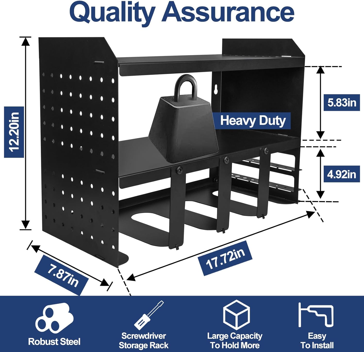 - Robust 80LB Load Capacity: Constructed from high-quality iron with precision cutting and a reinforced structure, this power tool storage rack ensures durability and a strong load-bearing capacity, eliminating worries about breakage or wall damage.