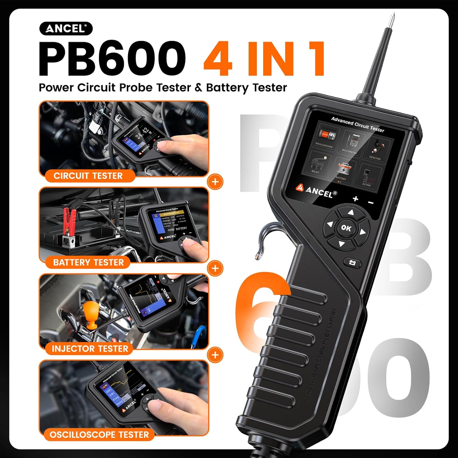 - 🚗【ALL-IN-ONE? TRY “ALL-IN-WIN”】*Ultimate Upgrade* to the PB100/PB500 that laughs at “just okay” tools. PB600 circuit tester can realize all the functions: ✅AC/DC Voltage Test ✅Frequency/Duty Cycle Test ✅Resistance/Diode Test ✅Fuel Injector ✅Fuse/Relay Test ✅Component Activation ✅Tracing Wire ✅Polarity Test ✅Continuity Test ✅Grounding Test ✅Trailer Light Test, and exclusive features: ✅Battery Test ✅Cranking Test ✅Charging Test ✅Oscilloscope Mode. This electrical tester is your ultimate solution, saving you valuable time and money. PB600: Because “Good Enough” is for Novice Drivers Pro Circuit Repairers, and DIY Amateurs.