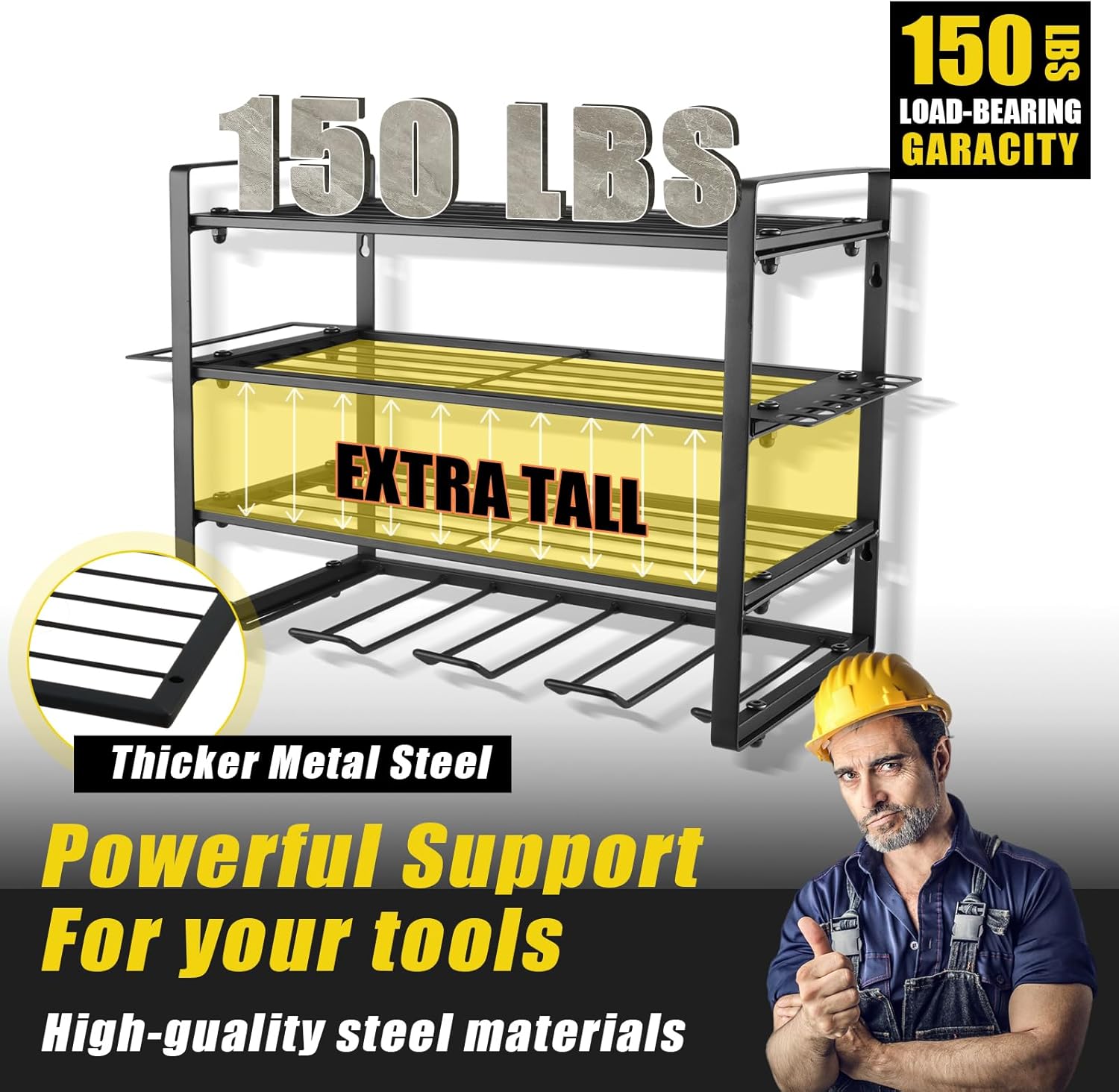 - Large Capacity 4-Tier Design: The garage tool organizer wall mount holds up to 8 cordless drills and other heavy and small tools. and a hammer holder, pliers holder and screwdriver holder are added to the side