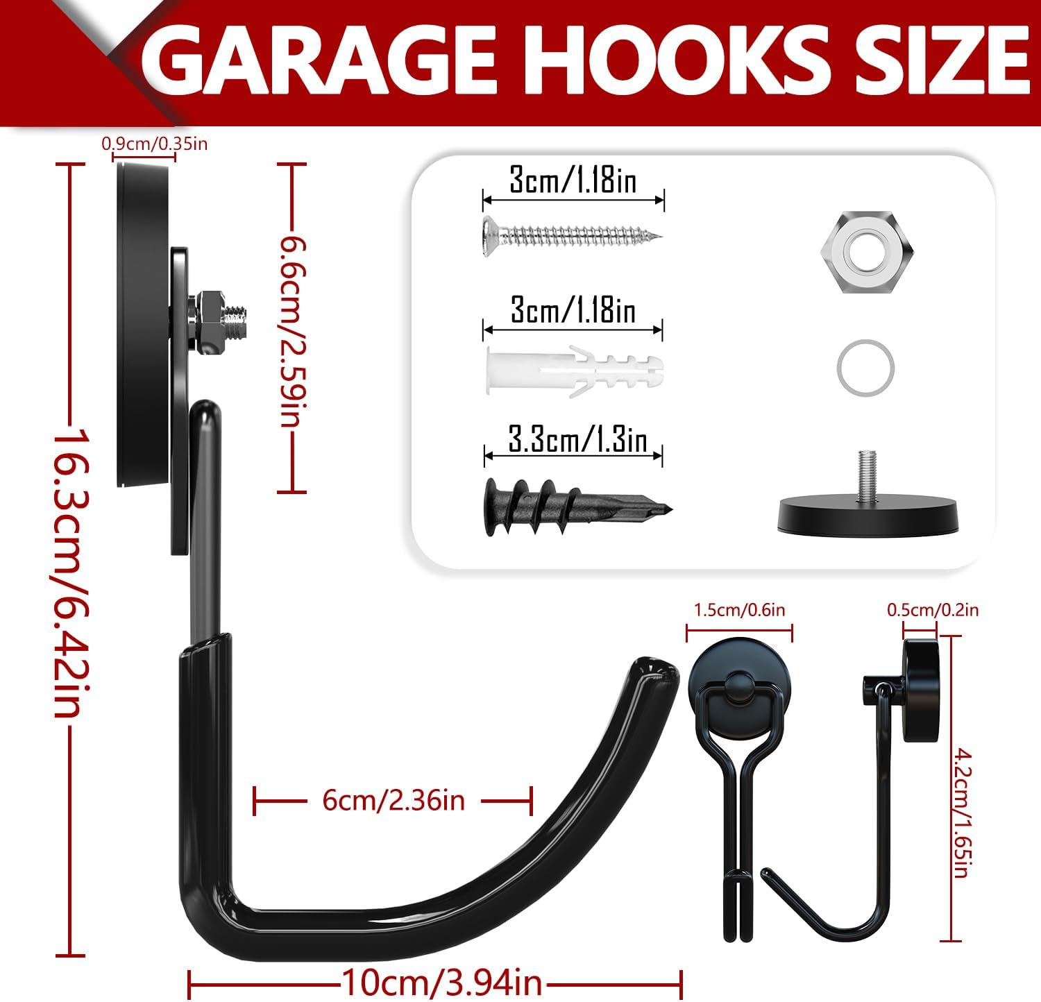 - Efficient Vertical Storage Solution: Discover the ultimate space-saving solution with our strong magnetic hooks. Versatile and reliable, these hooks are perfect for a multitude of environments, including garages, kitchens, offices, warehouses, gardens, and basements. These magnet hooks heavy duty help to reduce clutter and maximize available space, accommodating a variety of tools and equipment, including hoses, ropes, shovels, wires, cables, rakes, and more