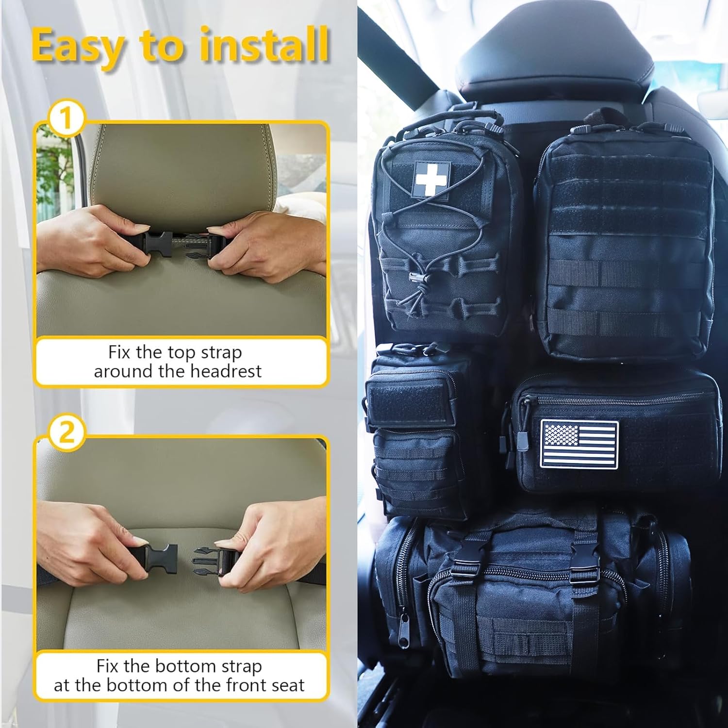- 🚗 Easy Installation - With adjustable strap,easily adjust to fit around your headrest and at the bottom between the seat back and base.Each Molle bags has been designed with velcro tape and buckle, each pouch is flexible to be added or removed.