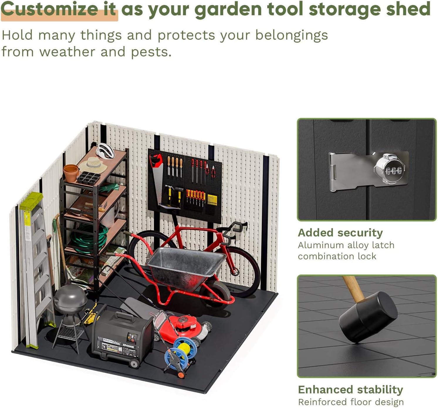 - Sturdy Plastic Floor Base for Enhanced Stability: Our outdoor resin shed features a robust plastic floor base, offering a secure foundation for storing your outdoor tools and equipment. It provides added protection against water damage and moisture, keeping your belongings safe and dry.