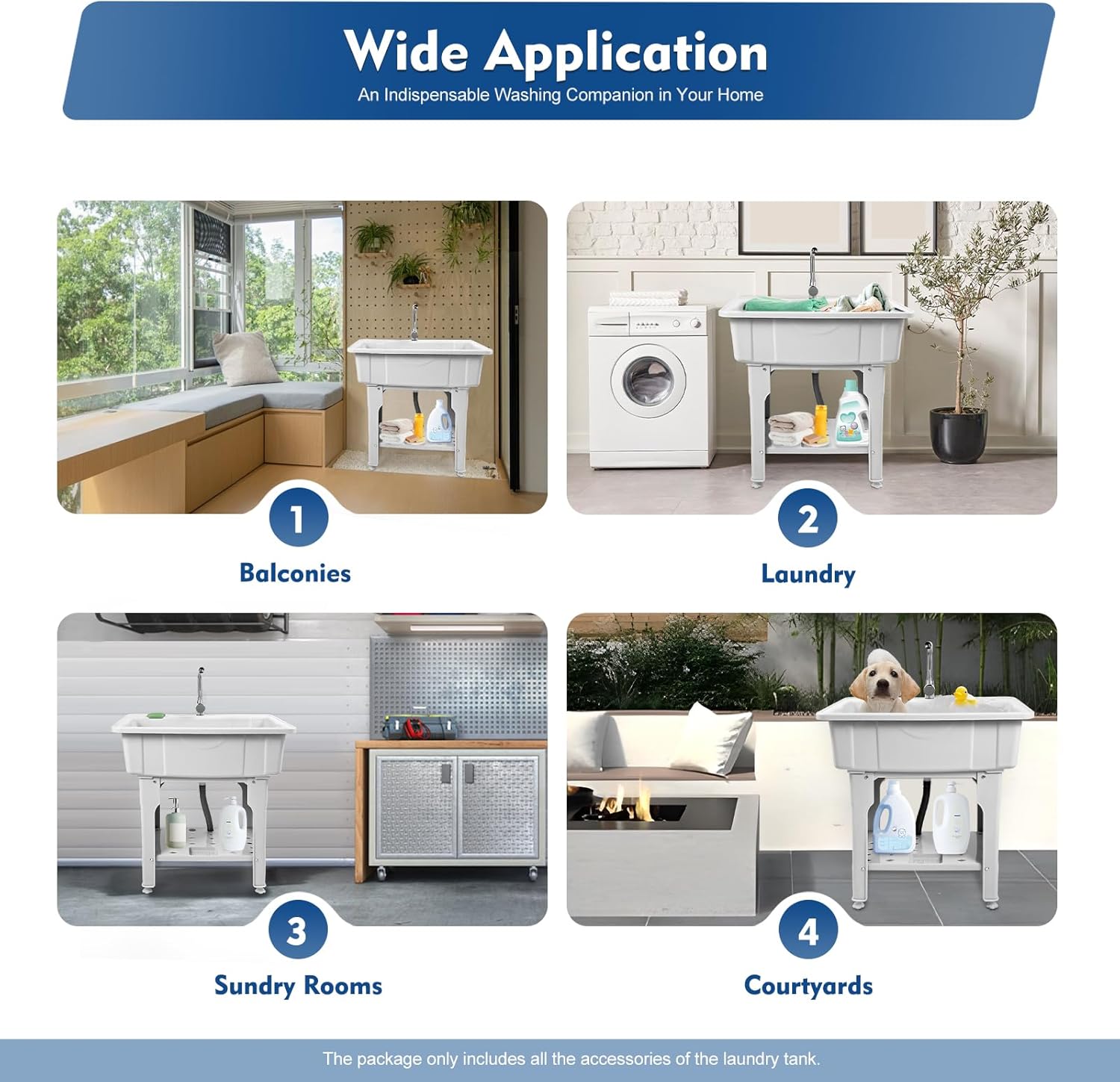 - ●【Application】The freestanding utility sink is applicable to laundry, bathrooms, sundry rooms, garages, basements, balconies, courtyards, gardens, etc. It can be used as a cleaning tank, pet bath, or storage rack.