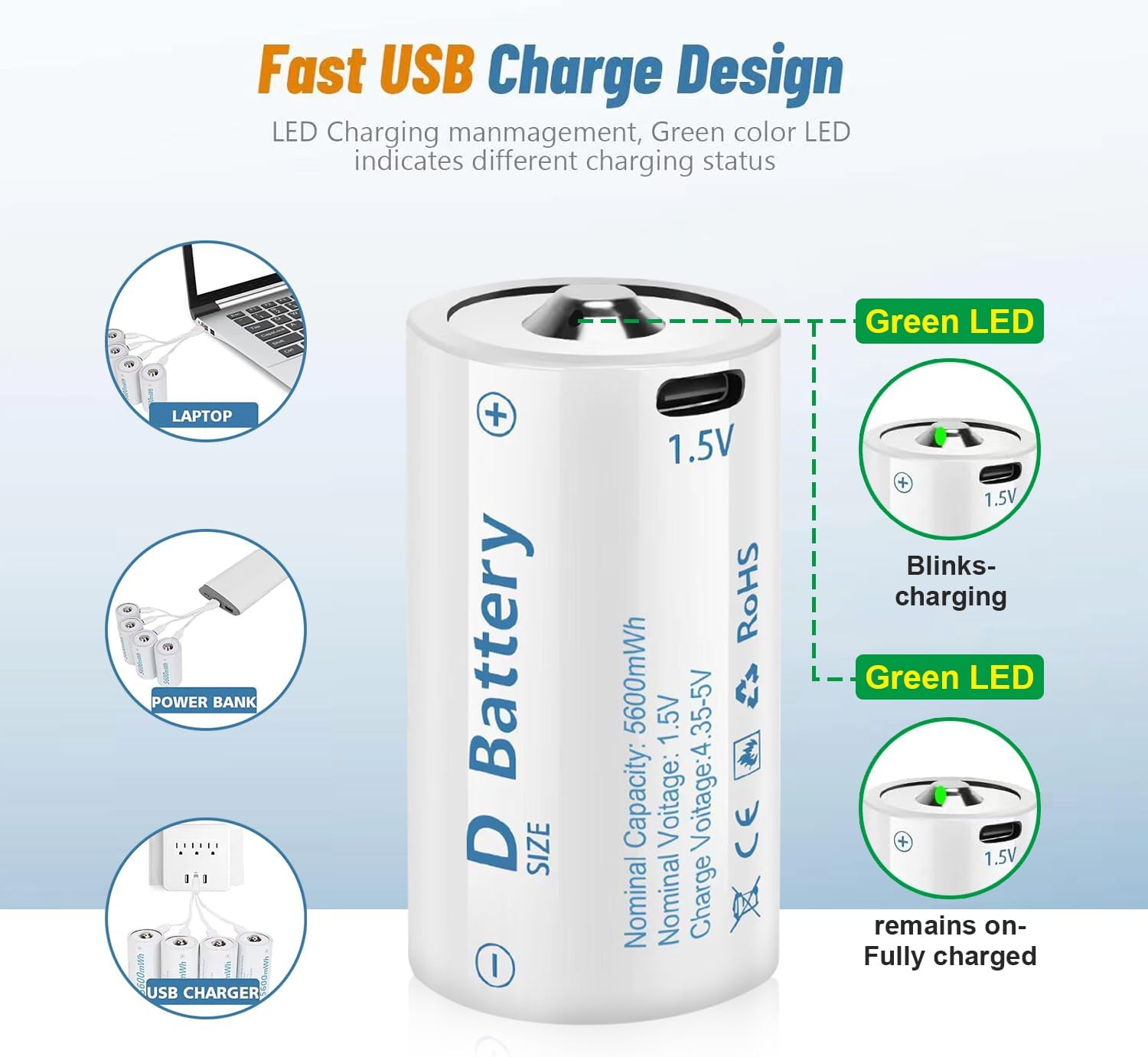 - 【USB Charge Design】D Cell batteries No need charger and adapter,fast full charge in about 2 hours,easy to charge with usb cable, just simply plug into USB ports