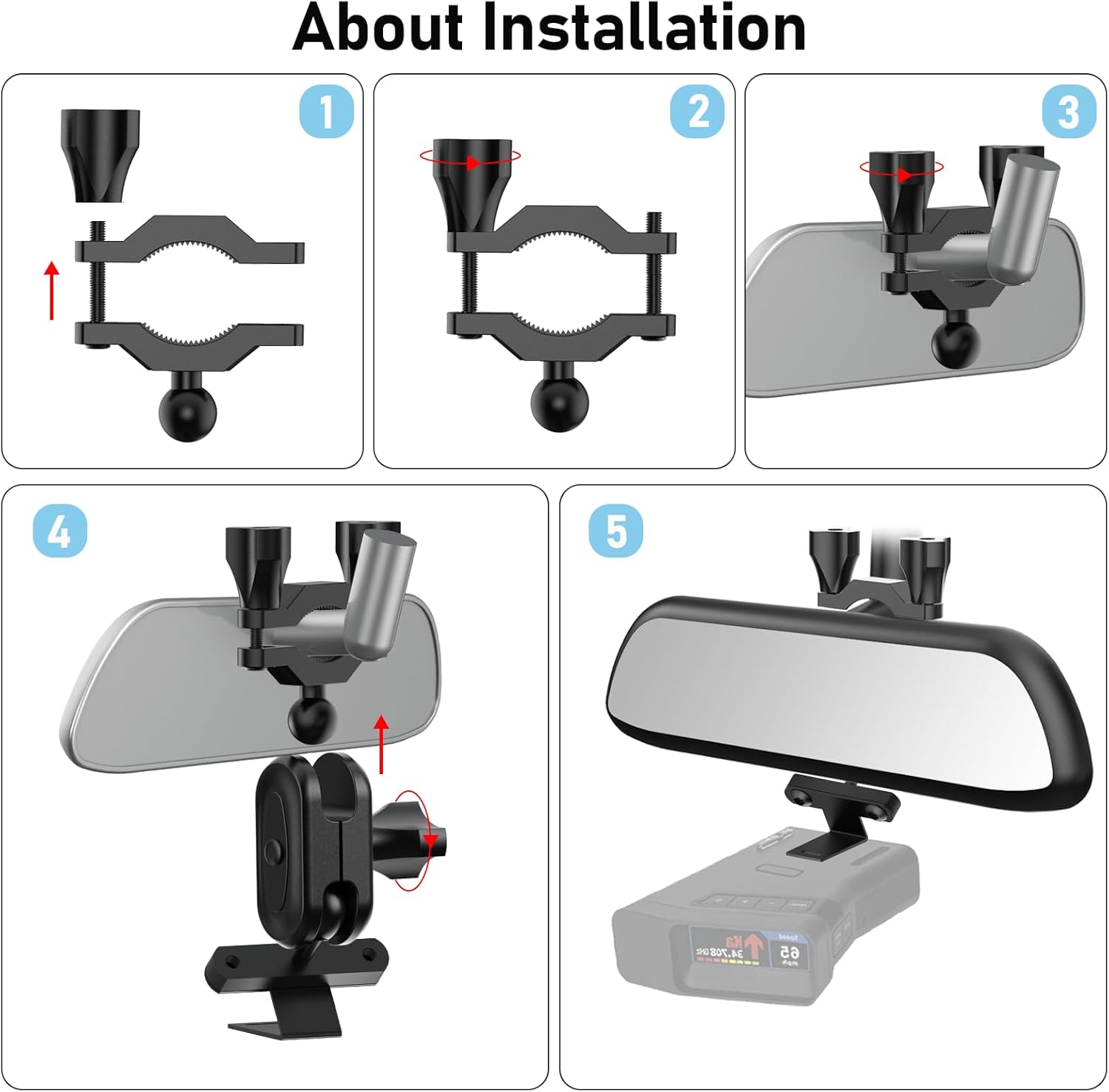 - Our radar detector holder is equipped with two 180° rotation ball heads,can makes you get a perfect viewing angle