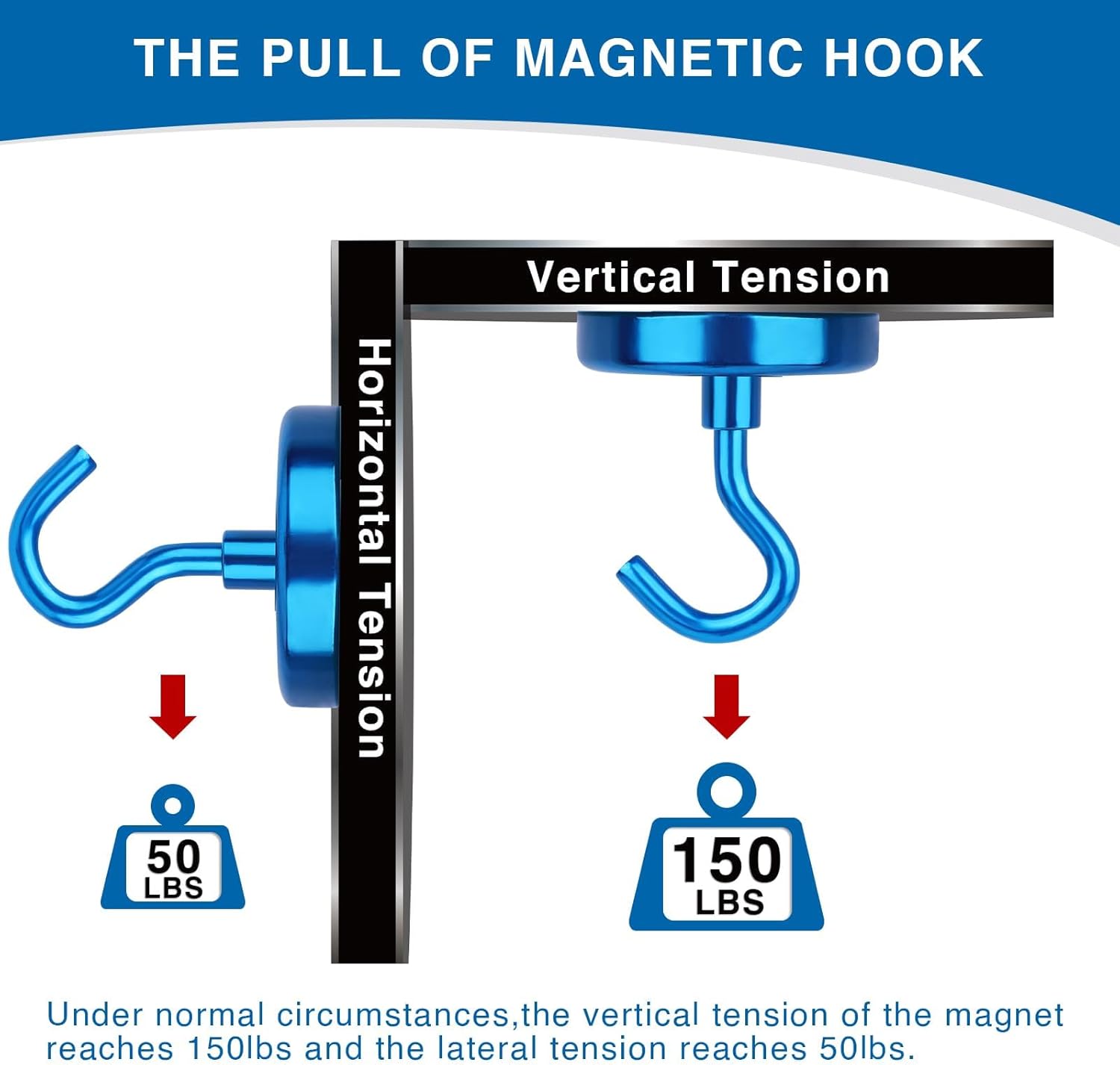 - 【BEARABLE TRACTION】 150 lbs tension of strong magnetic hook is based on the direction of tension perpendicular to the contact surface -- reduced by 2/3 if used horizontally. Please note that the tension of the magnetic hooks for hanging is also affected by the direction, the material of the contact surface and other factors.