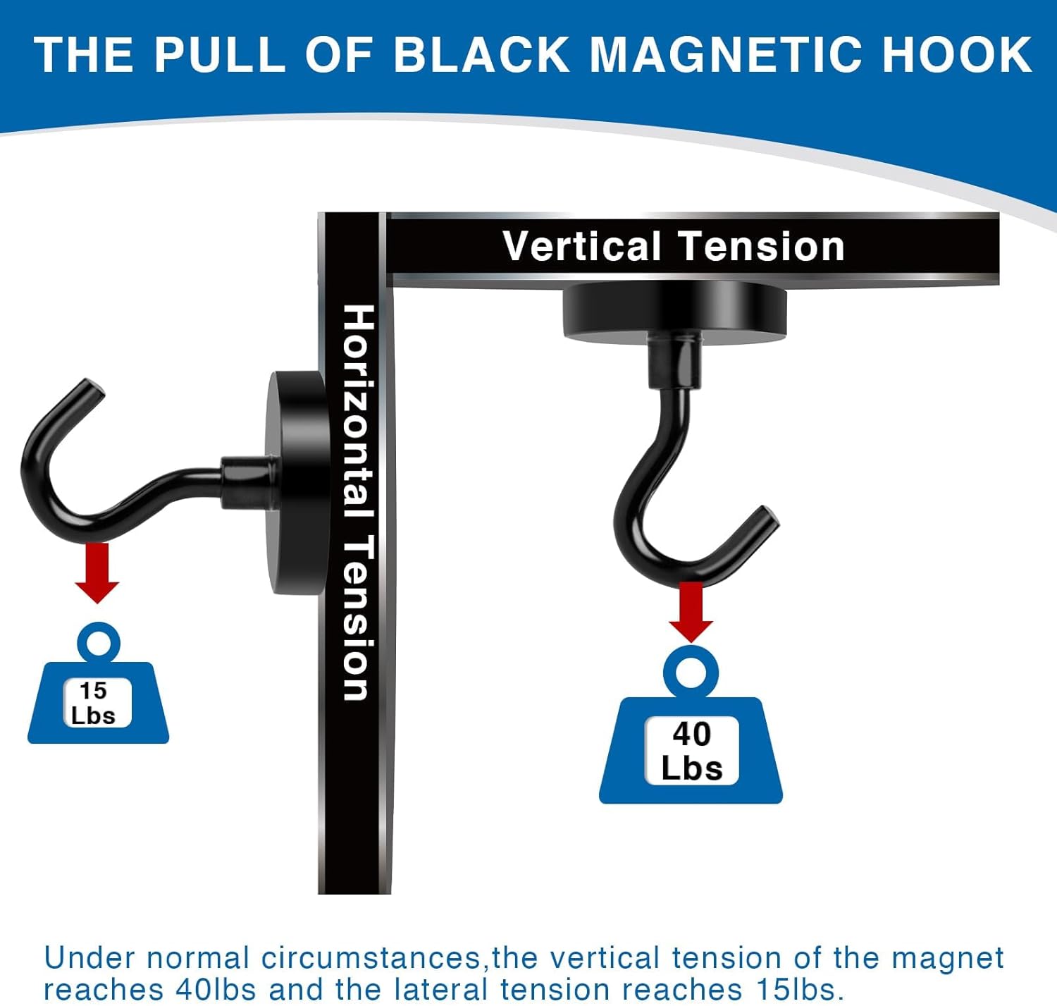 - 【BEARABLE TRACTION】 40 lbs tension of strong magnetic hook is based on the direction of tension perpendicular to the contact surface -- reduced by 2/3 if used horizontally. Please note that the tension of the magnetic hooks for hanging is also affected by the direction, the material of the contact surface and other factors.
