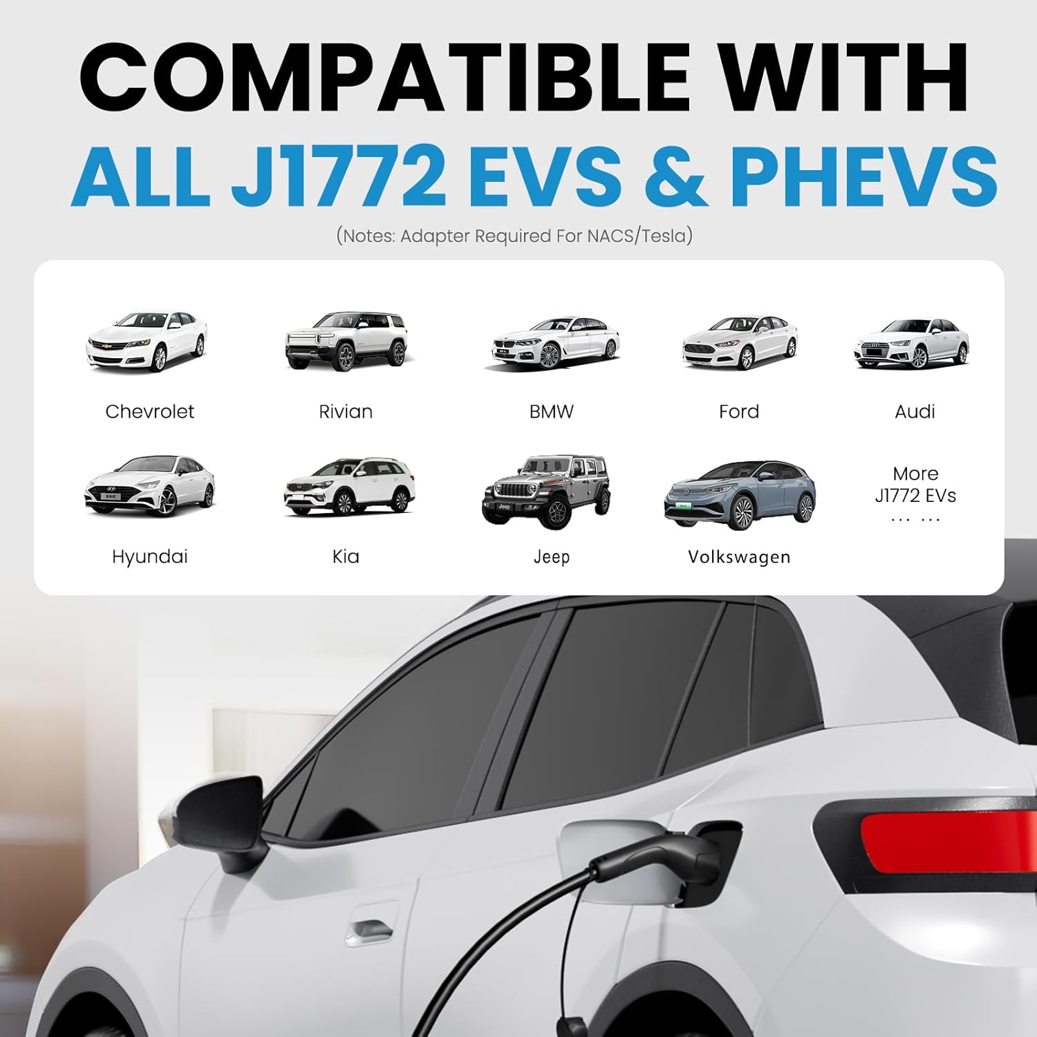 - Universal Compatibility: Equipped with a J1772 plug, this Romaa ev charger compatible with most SAE J1772 charger models, level 1 charger for Jeep, jeep wrangler 4xe, Kia, Hyundai, Ford, Nissan, Chevrolet, Audi, Volkswagen, BMW and more. (Note: Tesla requires an adapter.)
