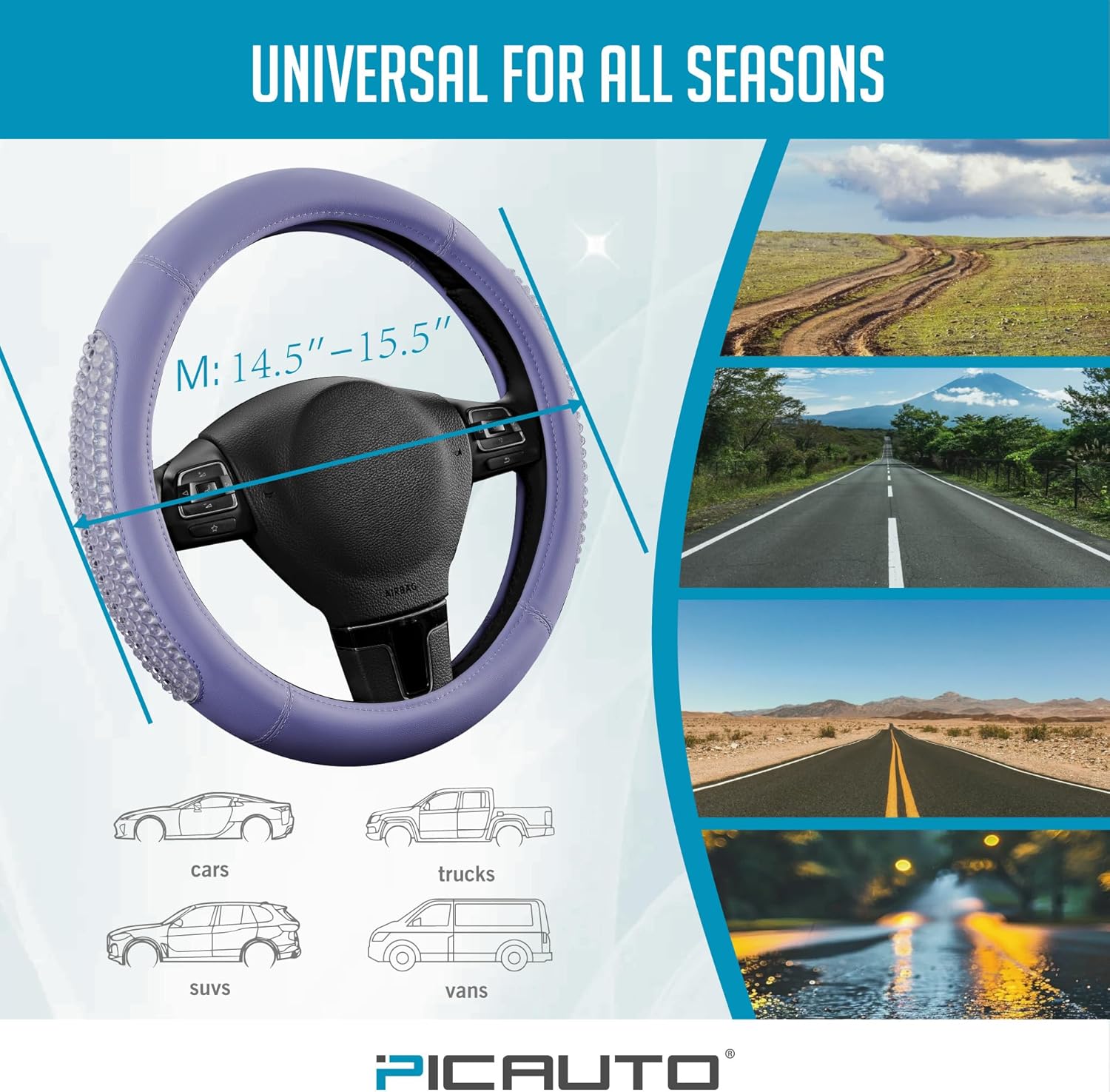PIC AUTO Gel Particles Steering Wheel Cover, Purple Luxury Leather Car Steering Wheel Protector, Universal Fit 14.5"-15.5" Anti-Slip Car Interior Accessories for Girls & Women