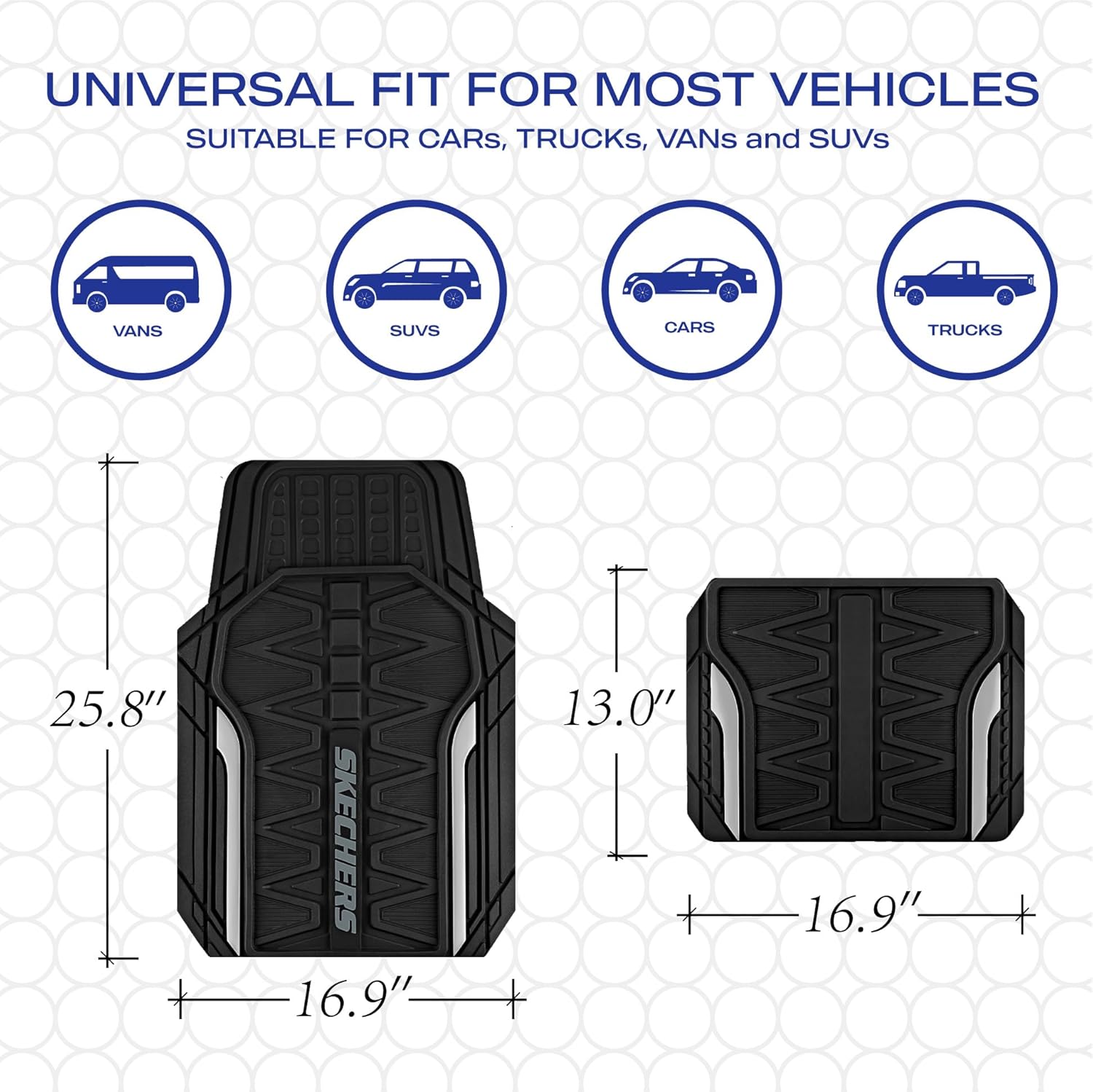 - CUSTOM FIT DESIGN-Engineered for quick and easy installation, Skechers Floor Mats are designed to fit most cars, trucks, pickups, and SUVs. The flexible universal liners can be easily trimmed with scissors to achieve a precise, custom fit for your vehicle, providing maximum protection and comfort. Enjoy a tailored look and enhanced durability with these adaptable floor mats