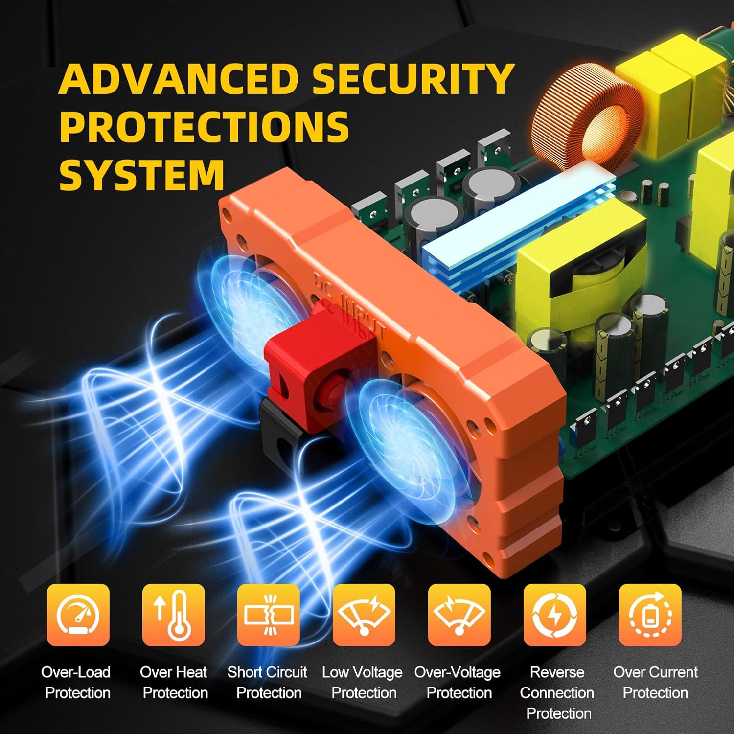 - 【INTELLIGENT LCD DISPLAY】: This 2000Watt inverter comes with a high-brightness real-time smart screen that simultaneously displays input and output voltages, battery and load status, multiple operating conditions for timely troubleshooting. At the same time, the output voltage and screen can be adjusted independently in a small range
