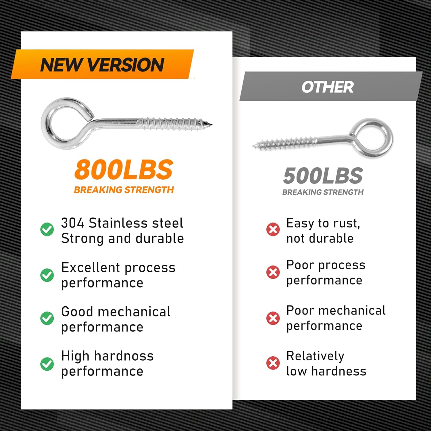 8Pcs 6 Inch Heavy Duty Screw Eyes Hooks, 304 Stainless Steel Self Tapping Eyelet Screw Eye Bolts,800LBS Breaking Strength, Screw in Eye Hooks for Wood Securing Cables Wire. (8, M10-6 Inch)