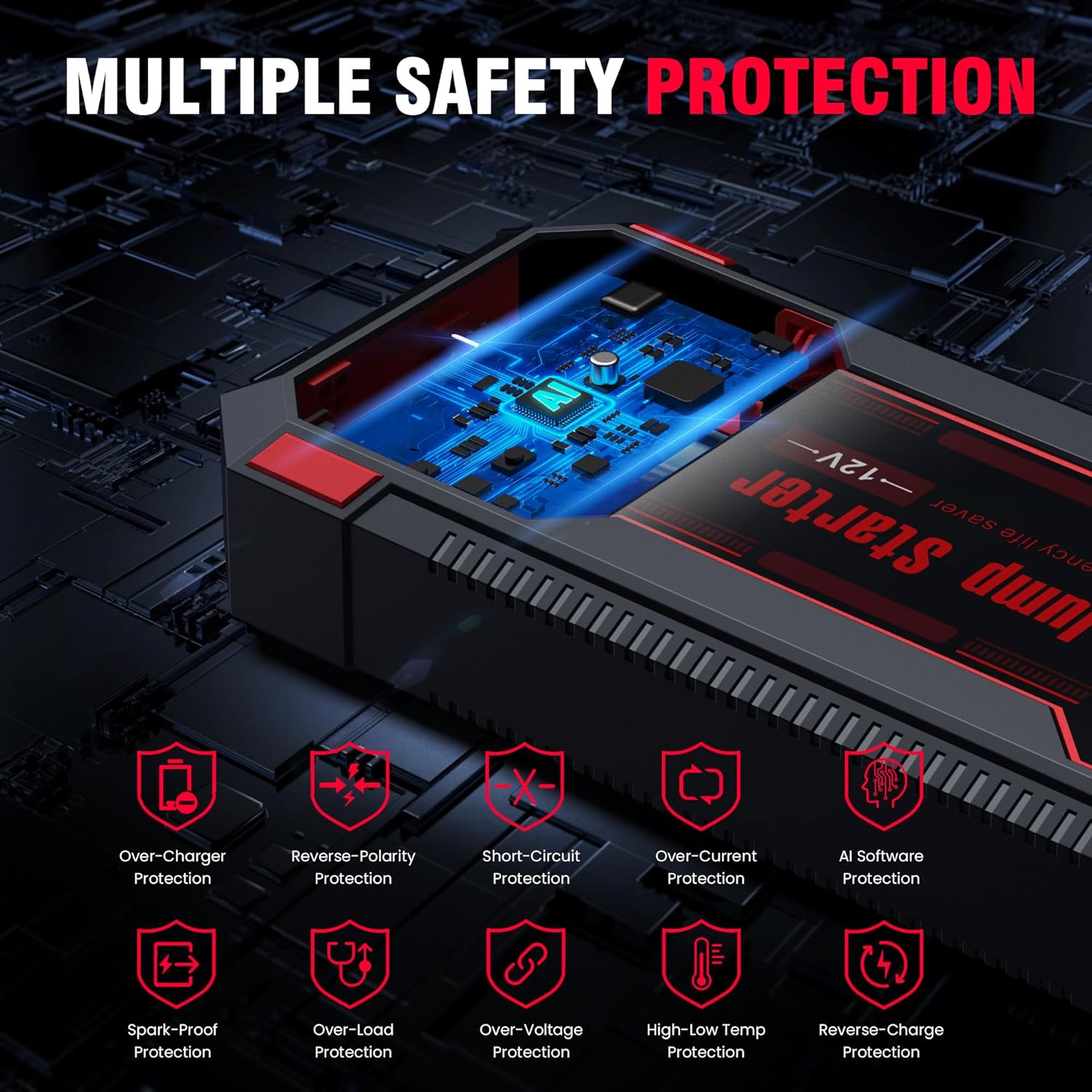 - 【Smart IC and Ultra Safe Design】More performs in safety efficiency and compatibility etc with Advanced intelligent controlling IC 100% checked and continuous aging test which it will brings you unprecedented convenience. Upgraded Built-in 10 multi-protection system and premium microchips to ensure your safety to the maximum. Trustworthy Car Battery Jump Starter with 3 Years Warranty!