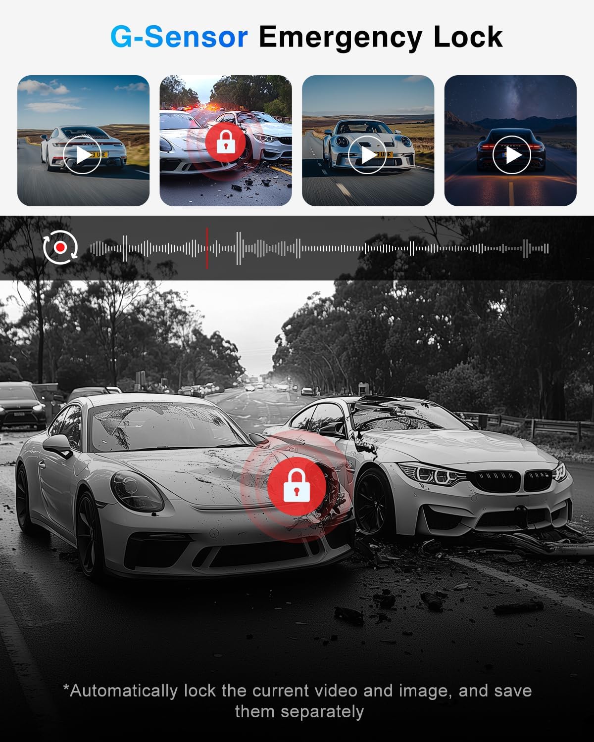 - 【Loop Recording & Gravity Sensor】Our car dash cam has loop recording function. When the memory card reaches the storage limit(max up to 256G, we provide a 64GB card in the package), the dash cam will automatically overwrite the previous stored unlocked files. Once the G-sensor detects that the dash camera is impacted by physical or gravity, the current video file will be locked as an emergency file to prevent the video from being overwritten even in loop recording.