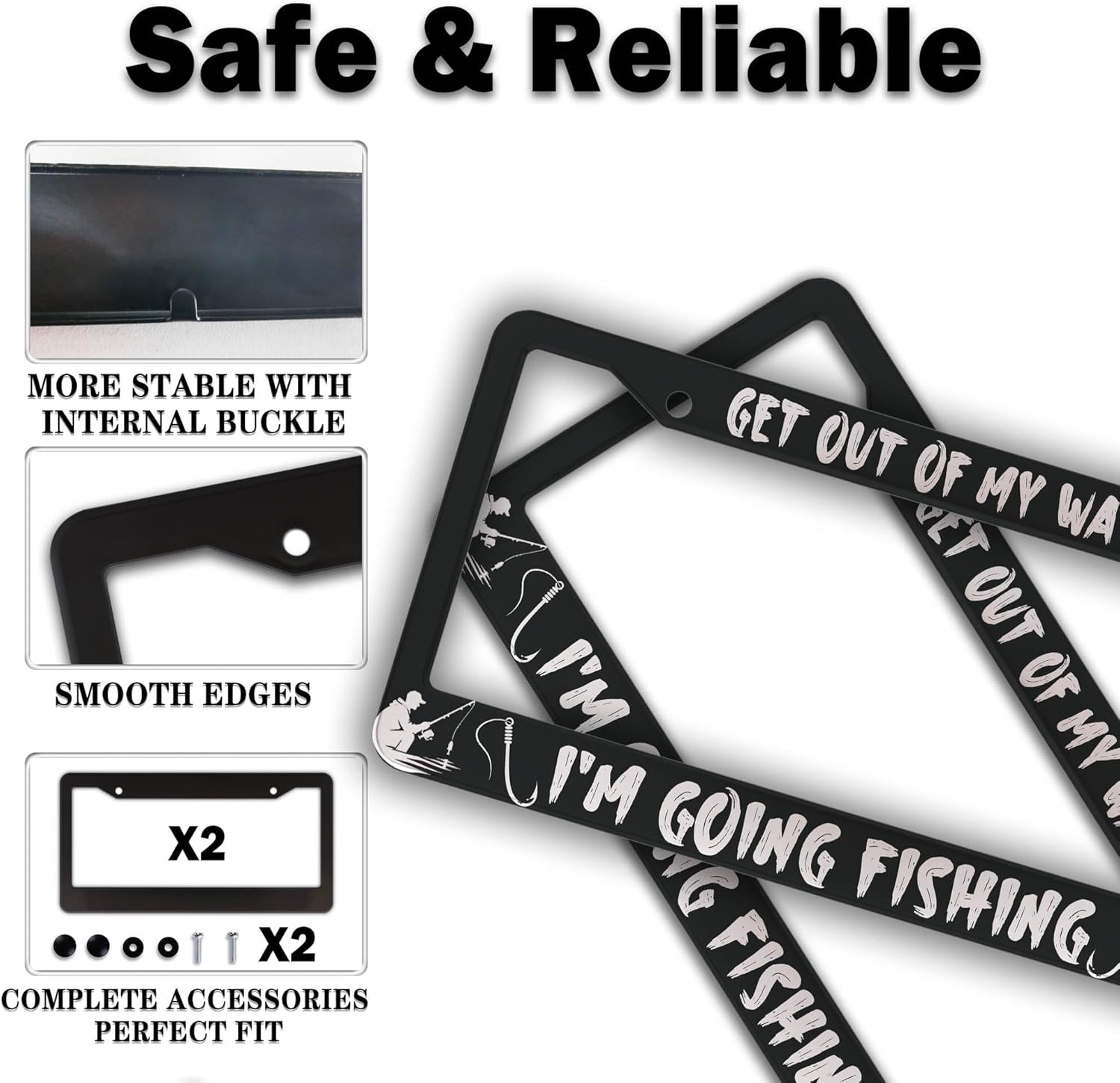 Car License Plate Frame Black and White License Plate Frames Get Out of My Way I'm Going Fish Aluminum Metal Car Accessory 2 Pack with Screw Covers Set