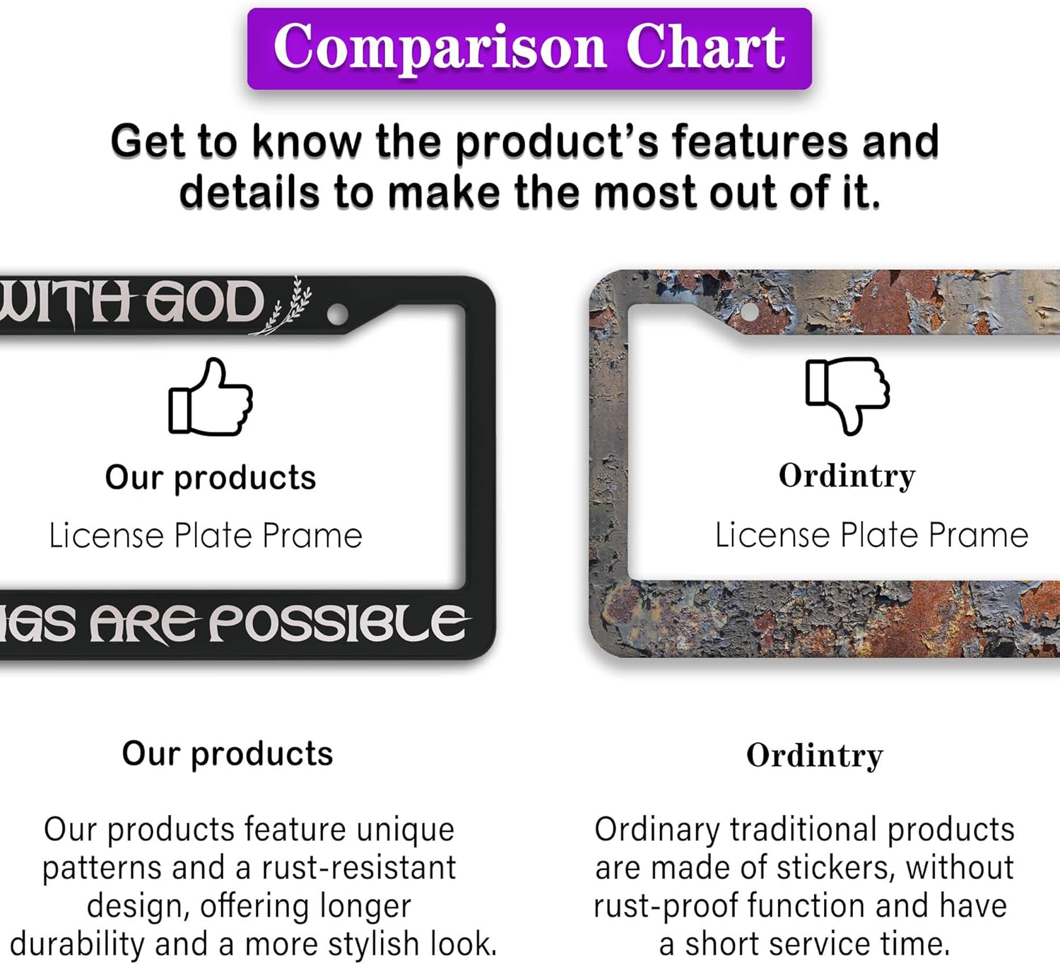 - ALUMINUM FRAME: This License Plate Frame is crafted from high-quality aluminum that is resistant to corrosion, rust, and harsh weather conditions. Its rugged reliability design ensures a long lifespan, making it capable of withstanding car washes and extreme weather, providing you with a reliable and stylish solution for your vehicle.
