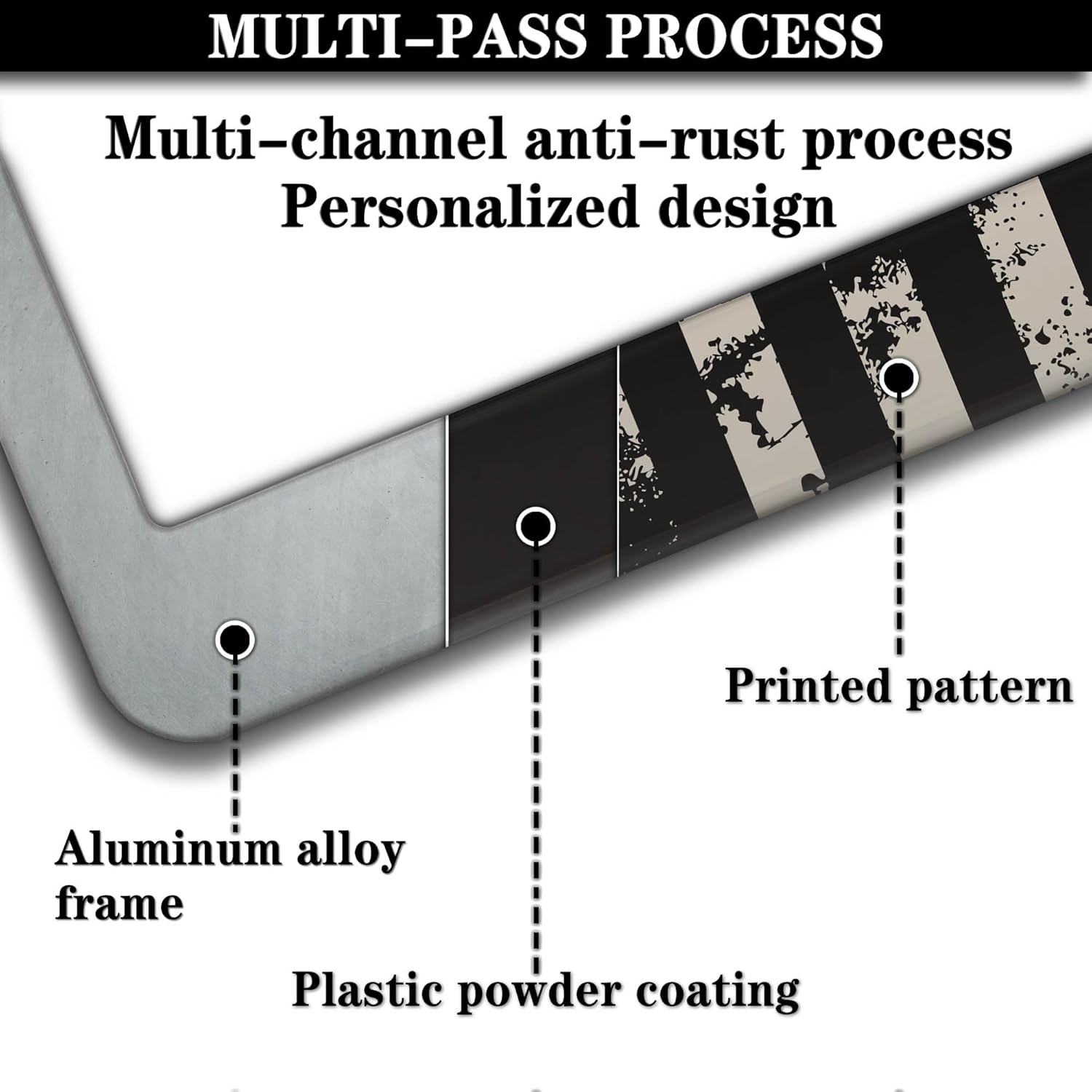 - ALUMINUM FRAME: This License Plate Frame is crafted from high-quality aluminum that is resistant to corrosion, rust, and harsh weather conditions. Its rugged reliability design ensures a long lifespan, making it capable of withstanding car washes and extreme weather, providing you with a reliable and stylish solution for your vehicle.