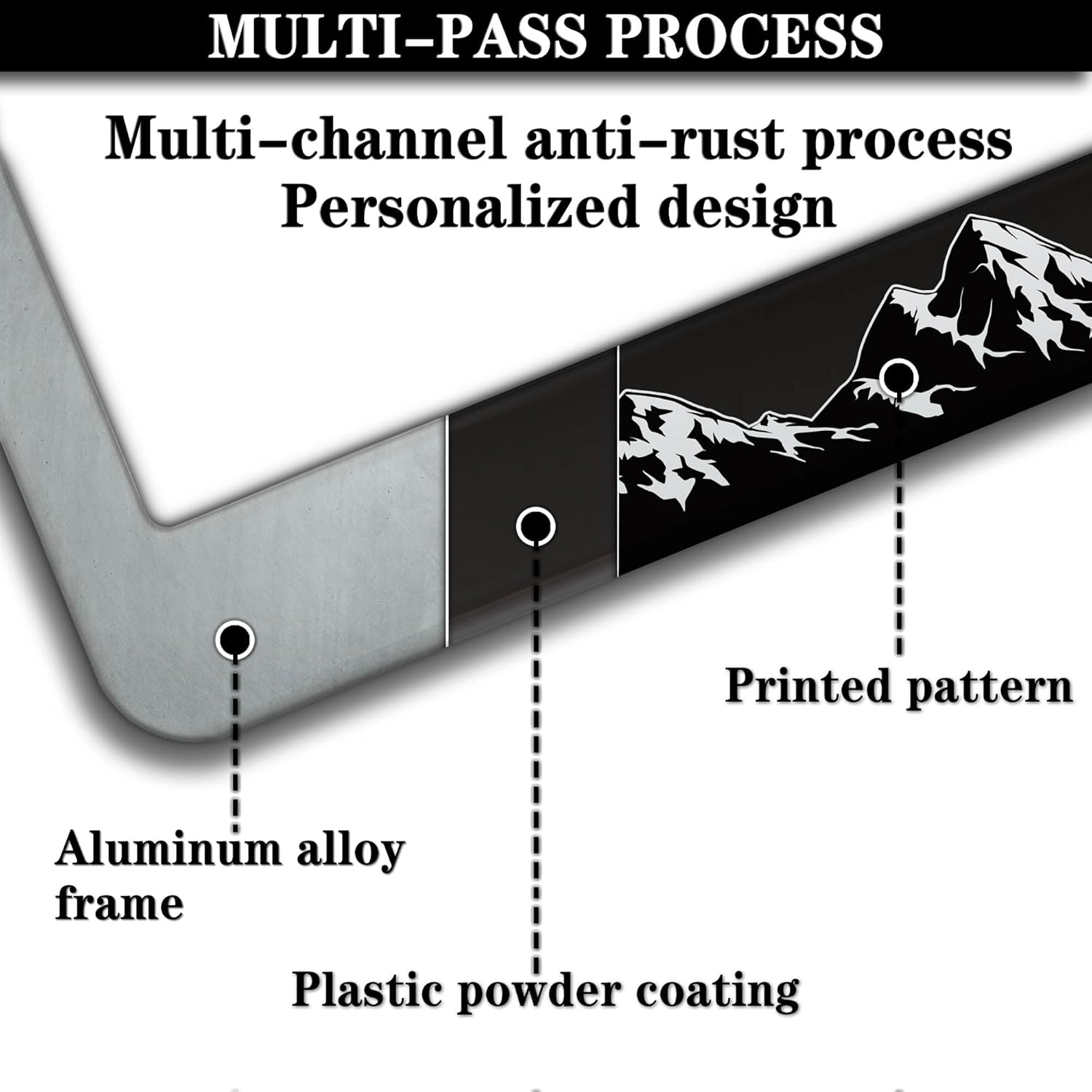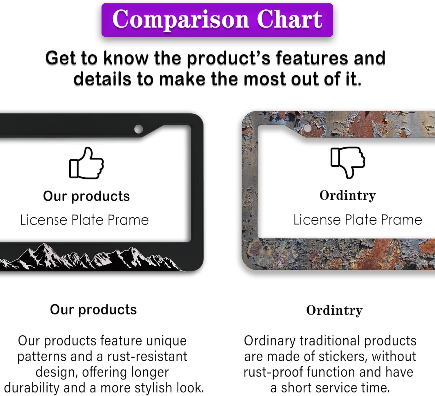 - ALUMINUM FRAME: This License Plate Frame is crafted from high-quality aluminum that is resistant to corrosion, rust, and harsh weather conditions. Its rugged reliability design ensures a long lifespan, making it capable of withstanding car washes and extreme weather, providing you with a reliable and stylish solution for your vehicle.