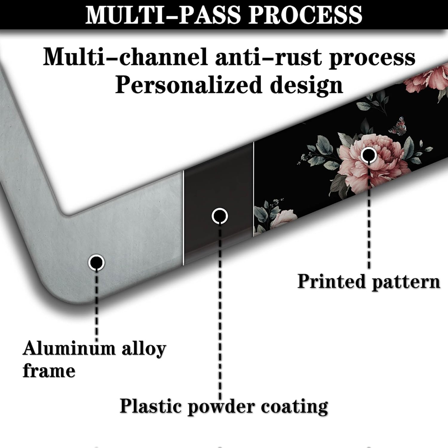 - ALUMINUM FRAME: This License Plate Frame is crafted from high-quality aluminum that is resistant to corrosion, rust, and harsh weather conditions. Its rugged reliability design ensures a long lifespan, making it capable of withstanding car washes and extreme weather, providing you with a reliable and stylish solution for your vehicle.