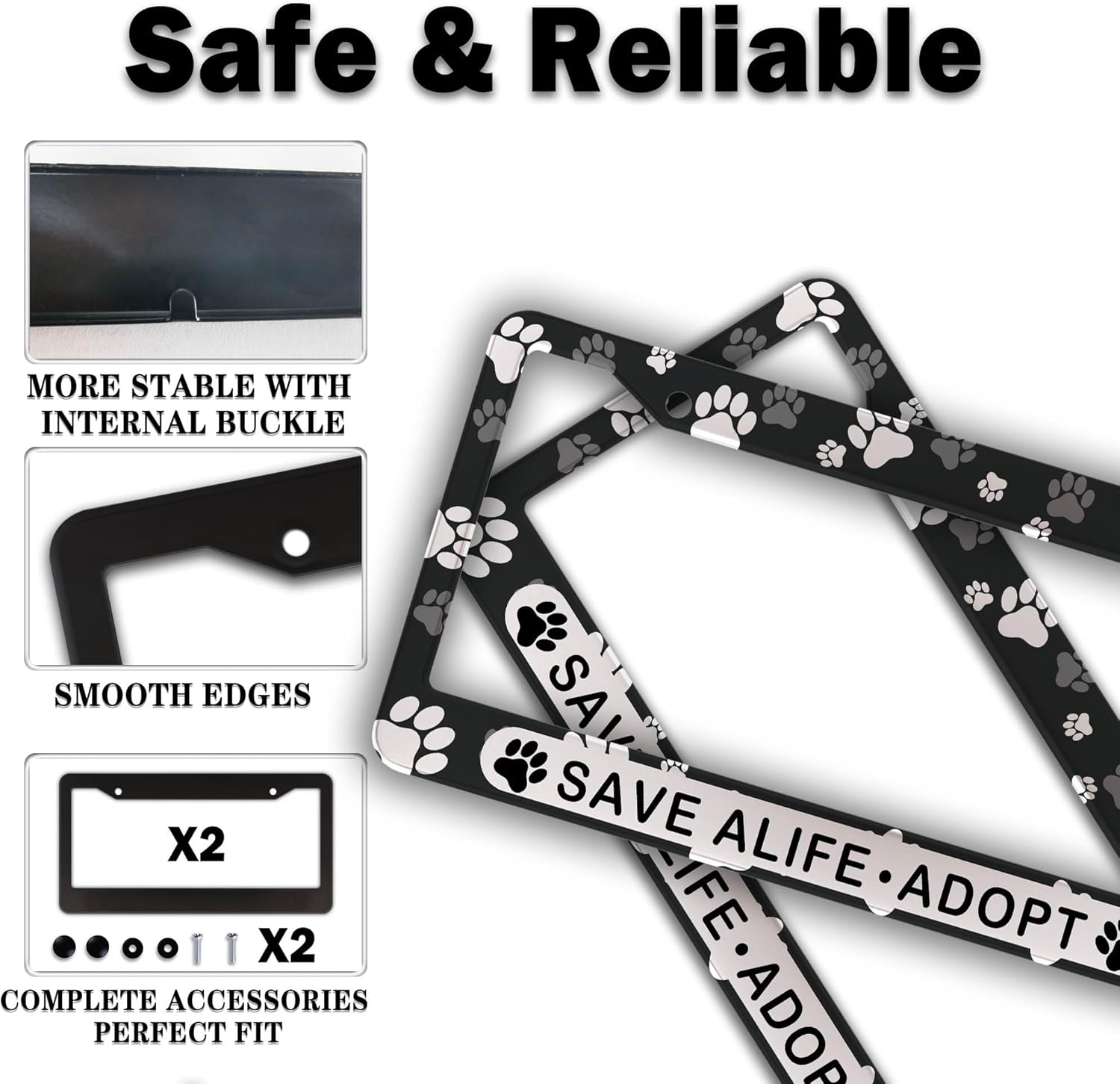 License Plate Holder Black and White License Plate Frames Save a Life Adopt Aluminum Metal Car Accessory 2 Pack with Screw Covers Set