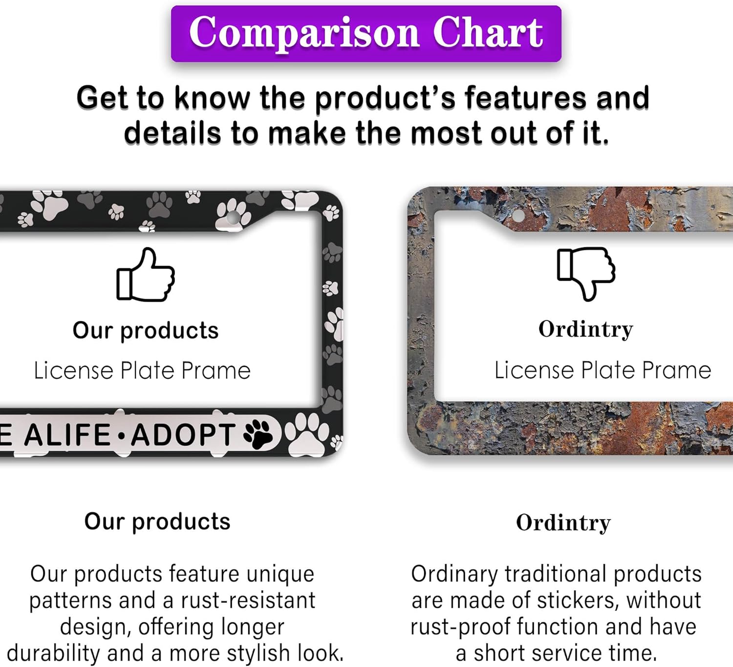 - ALUMINUM FRAME: This License Plate Frame is crafted from high-quality aluminum that is resistant to corrosion, rust, and harsh weather conditions. Its rugged reliability design ensures a long lifespan, making it capable of withstanding car washes and extreme weather, providing you with a reliable and stylish solution for your vehicle.