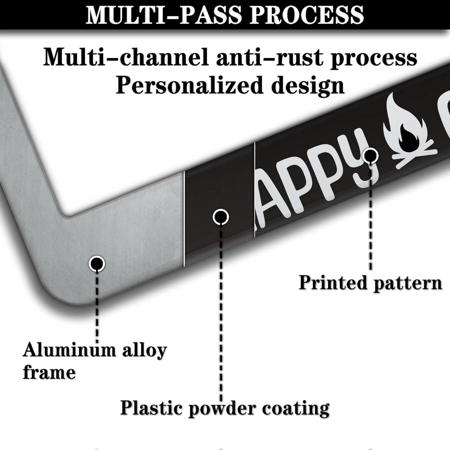 License Plate Frames Black and White Metal License Plate Frame Happy Camper with Campfire Universal Aluminum Car Accessory 2 Pack with Screw Covers Set