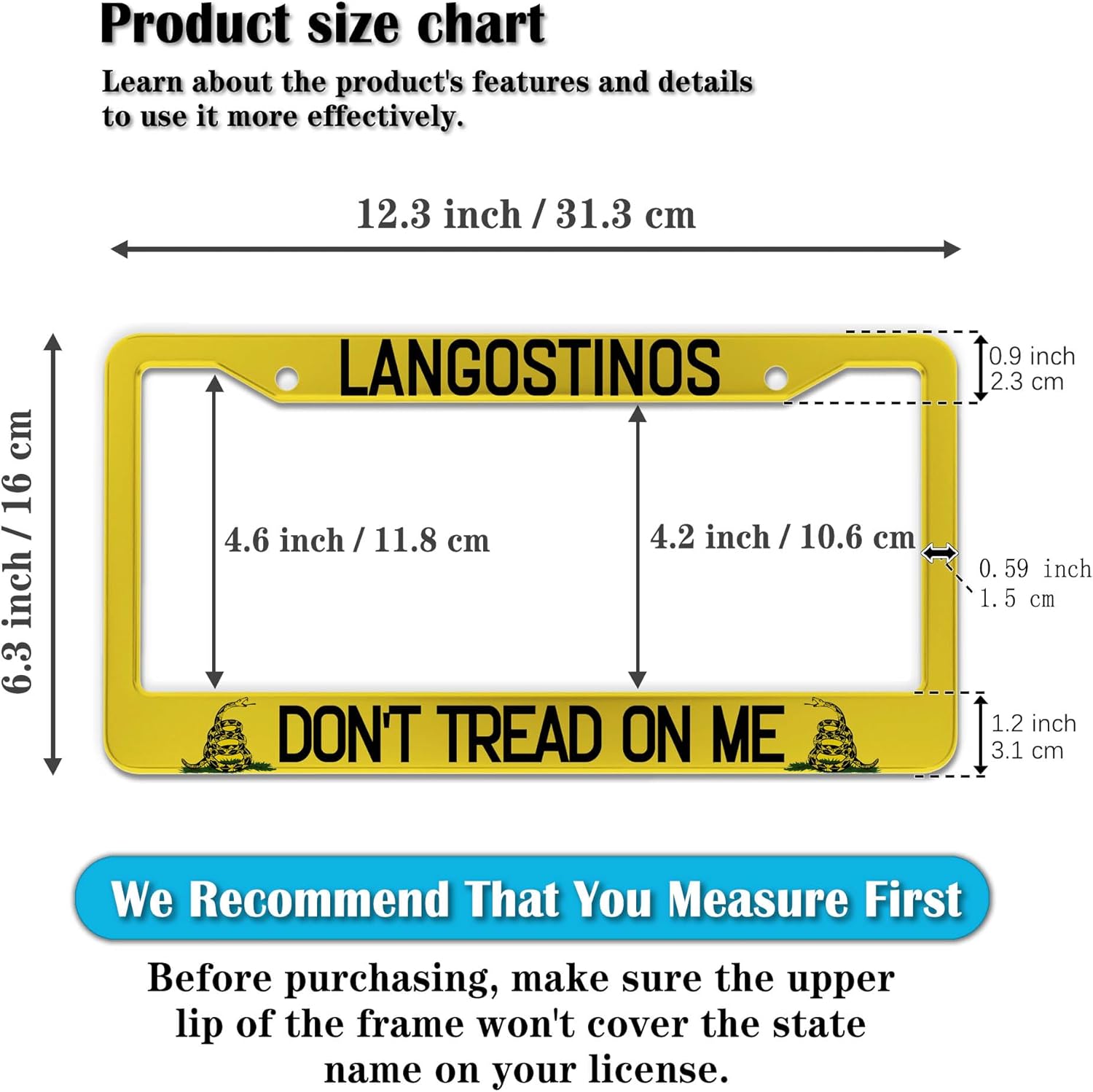 - STANDARD FRAME SIZE: Ensure a perfect fit by checking the dimensions to avoid covering your state name. These frames are specifically designed to fit standard American license plates measuring approximately 12.3" x 6.3" (16 x 31 cm). for most license plates in the U.S.
