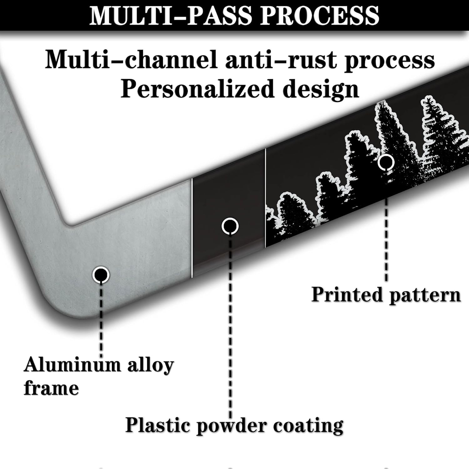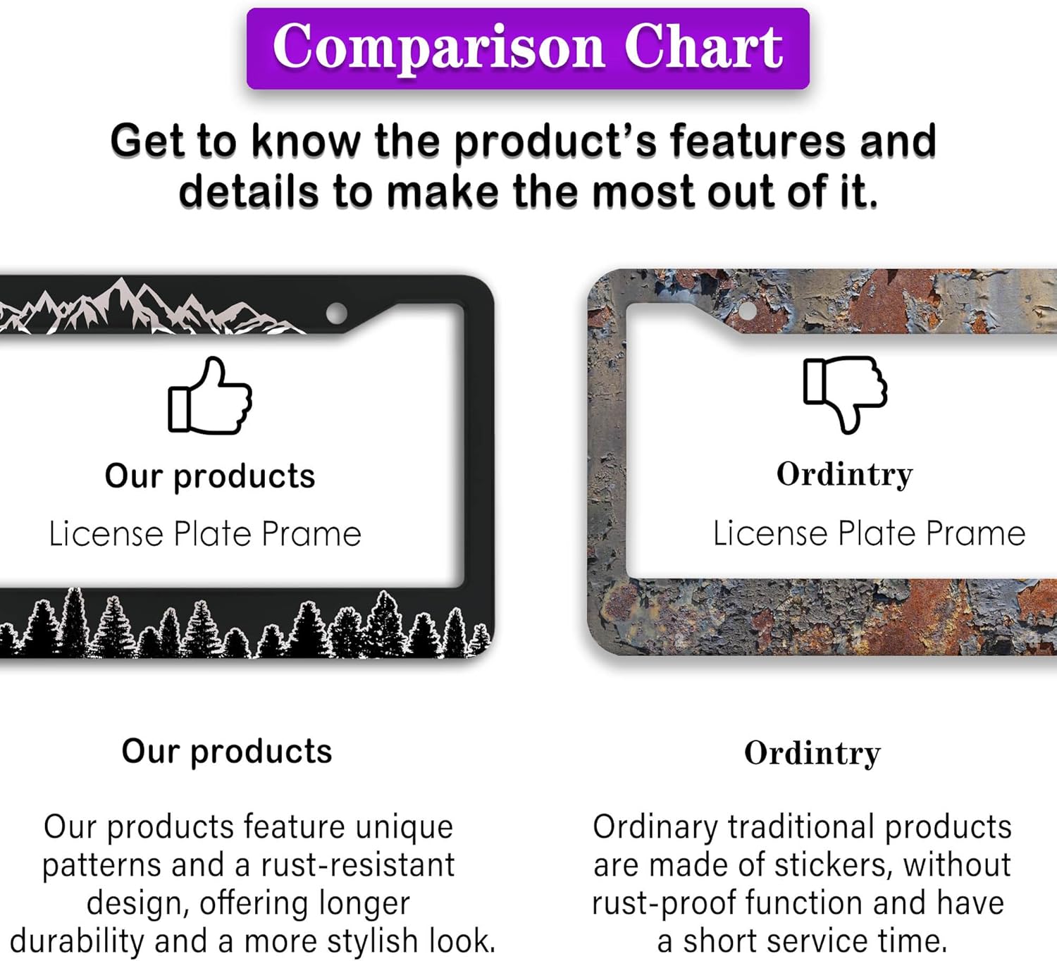 - ALUMINUM FRAME: This License Plate Frame is crafted from high-quality aluminum that is resistant to corrosion, rust, and harsh weather conditions. Its rugged reliability design ensures a long lifespan, making it capable of withstanding car washes and extreme weather, providing you with a reliable and stylish solution for your vehicle.