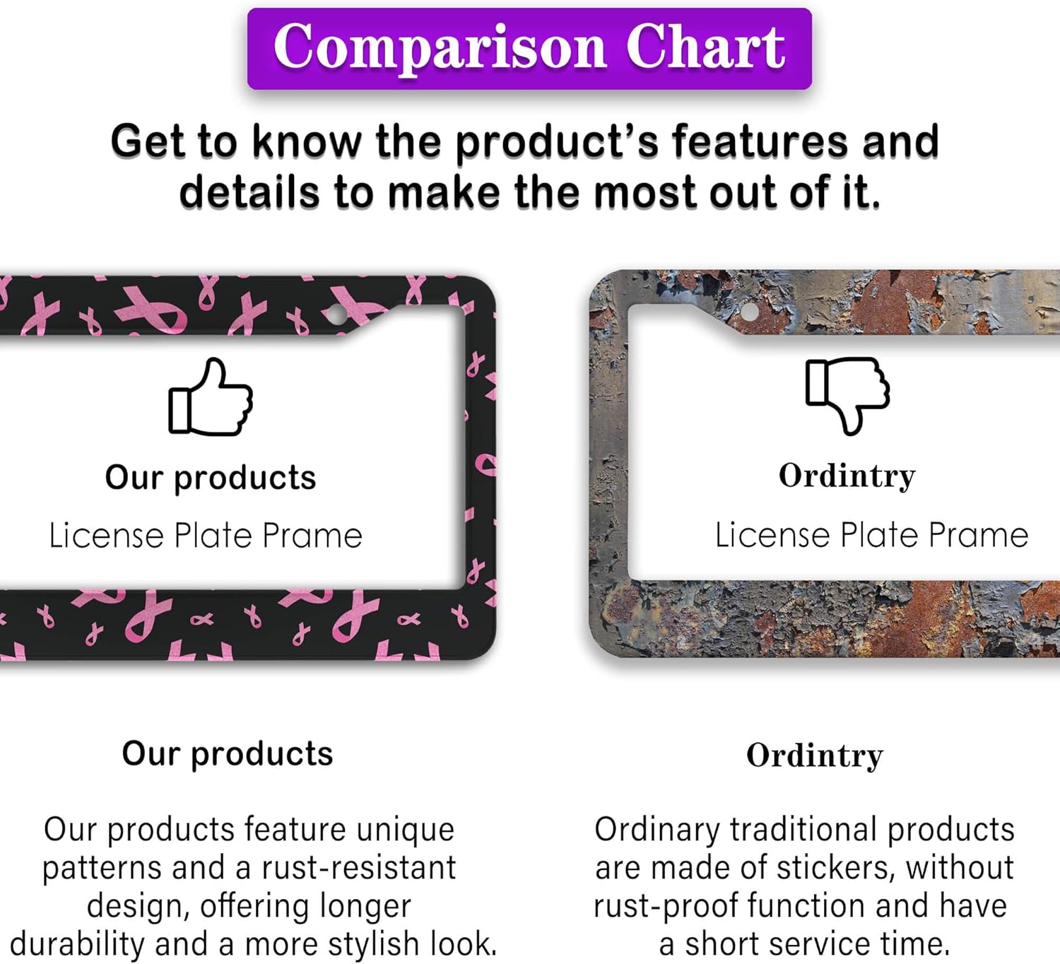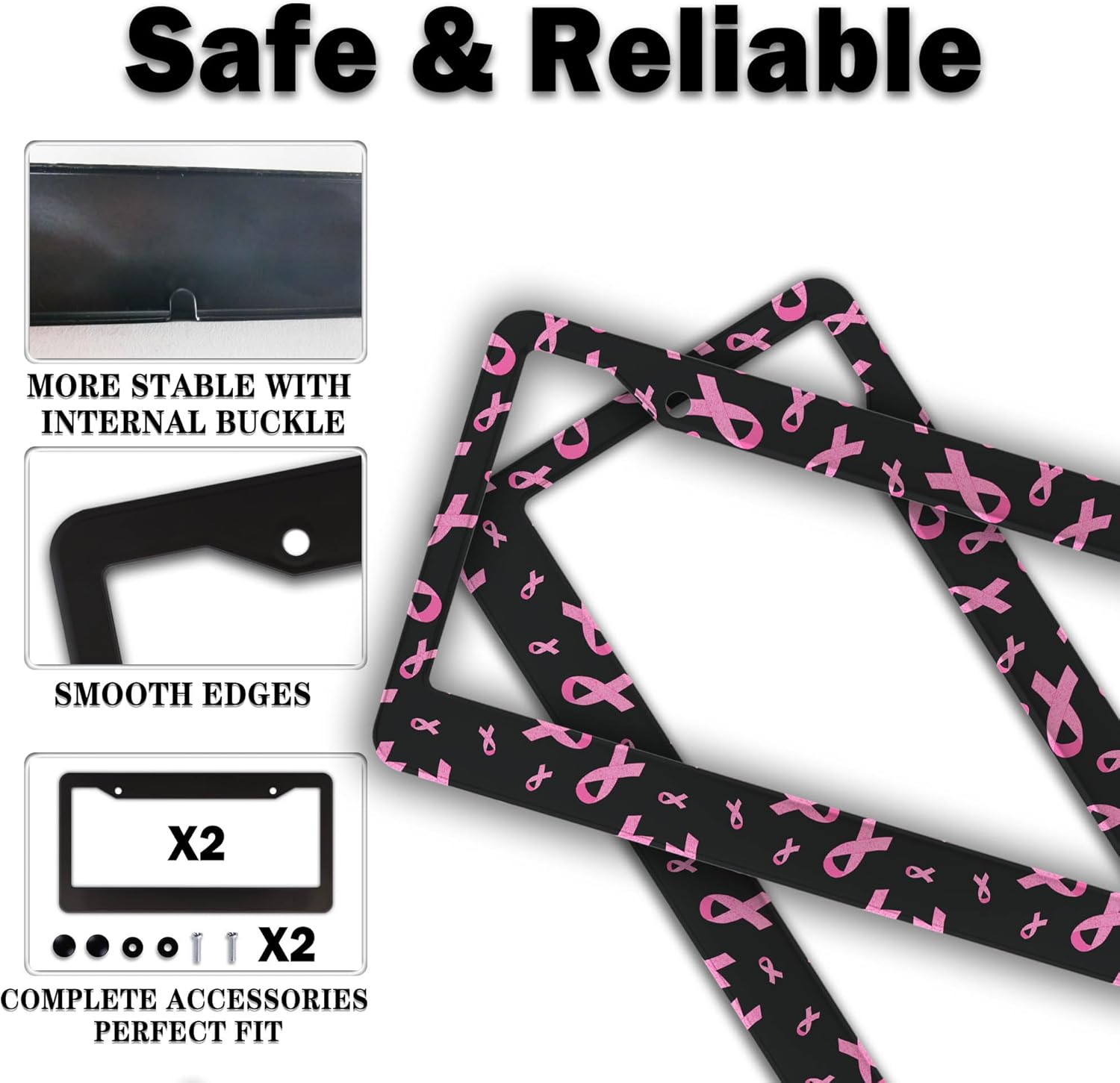 License Plate Frames for Men Black Powder Car License Plate Frame for Women Pink Ribbon Aluminum Metal Car Accessory 2 Pack with Screw Covers Set