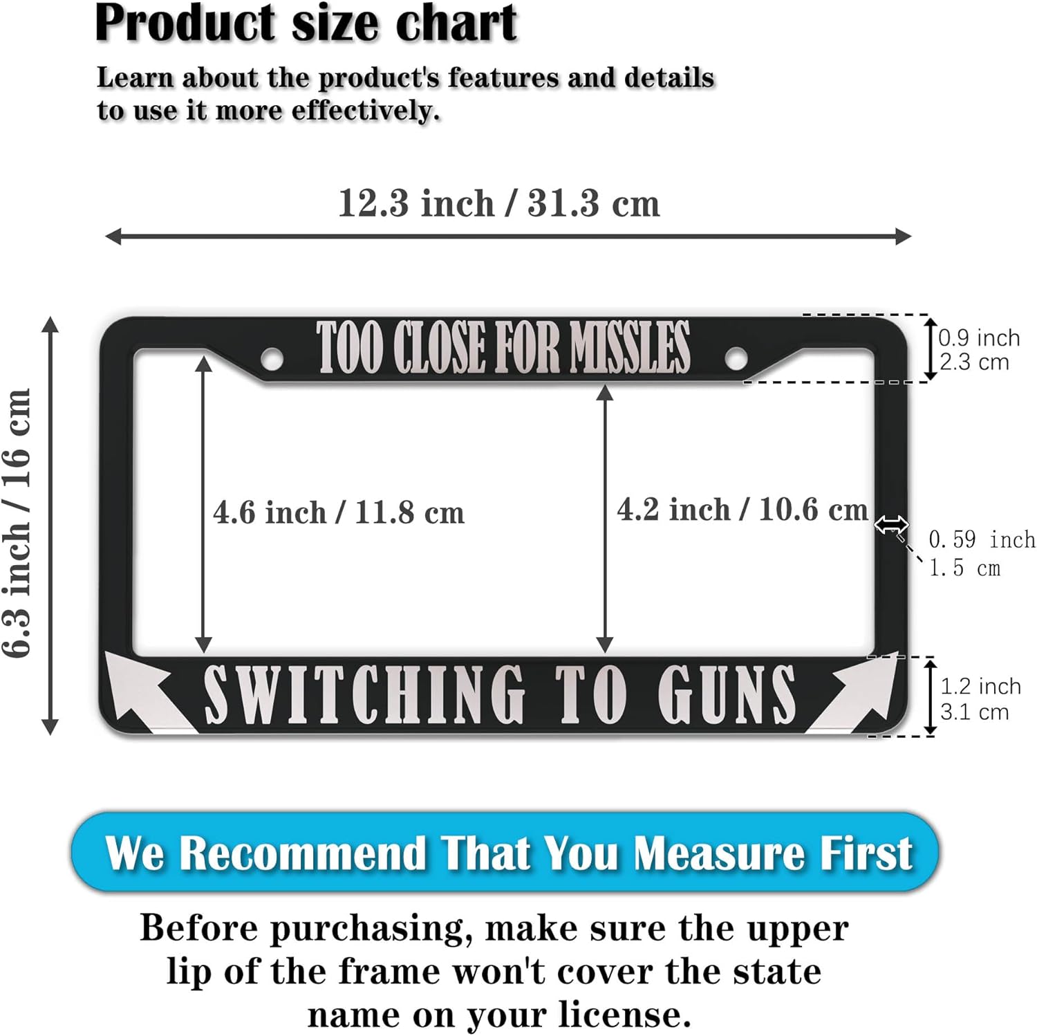 License Plate Frames Black and White License Plate Cover Too Close Missiles Switching to Guns Aluminum Metal Car Accessory 2 Pack with Screw Covers Set