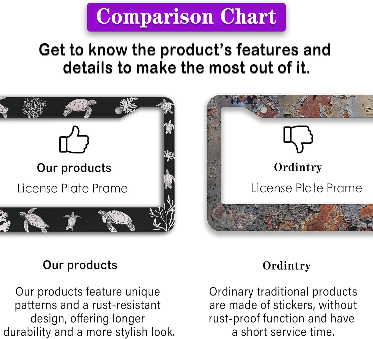 - ALUMINUM FRAME: This License Plate Frame is crafted from high-quality aluminum that is resistant to corrosion, rust, and harsh weather conditions. Its rugged reliability design ensures a long lifespan, making it capable of withstanding car washes and extreme weather, providing you with a reliable and stylish solution for your vehicle.