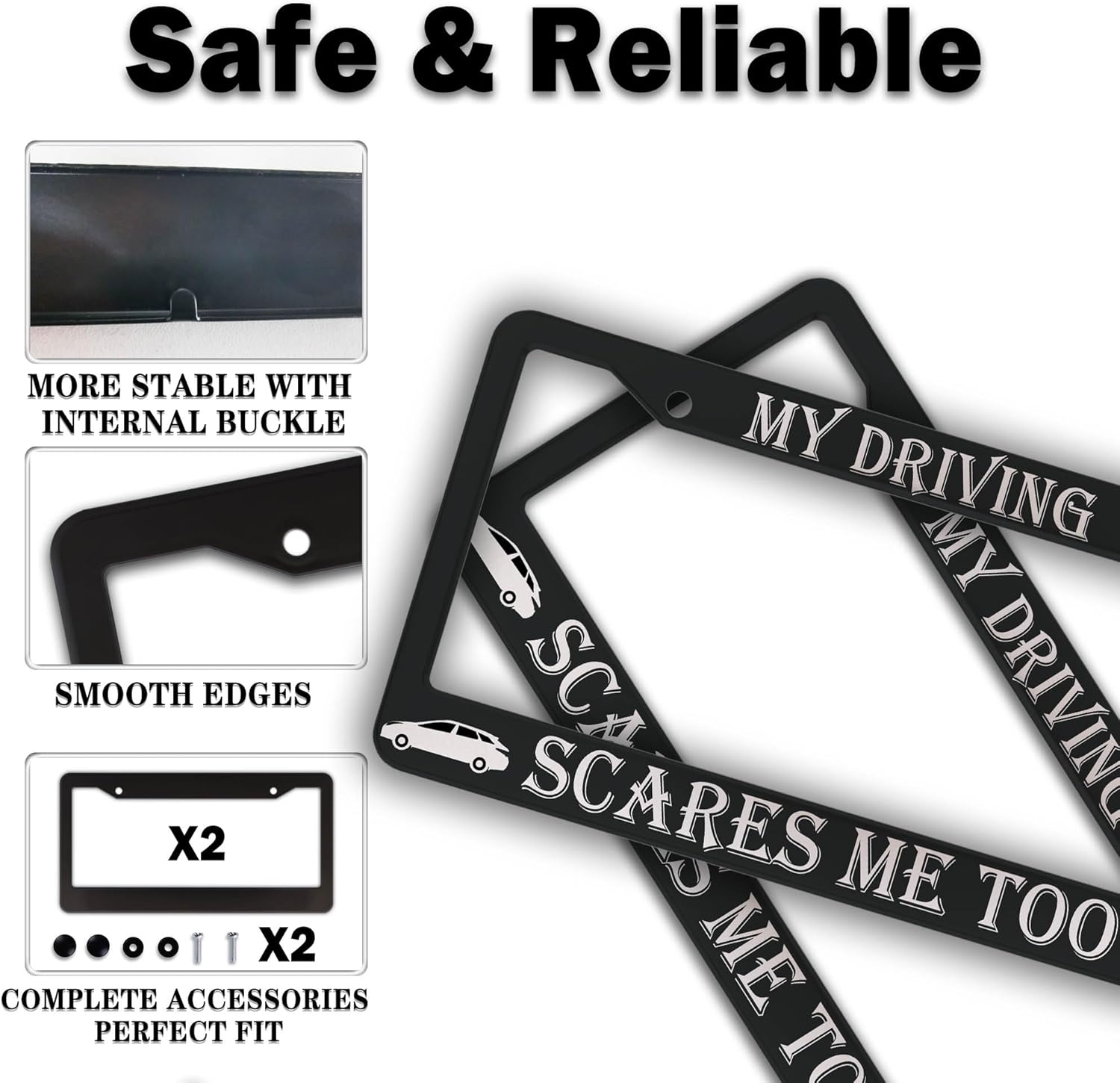 Fun License Plate Frame Cover Black and White License Plate Frames My Driving Scares Me Too Universal Aluminum Car Accessory 2 Pack with Screw Covers Set