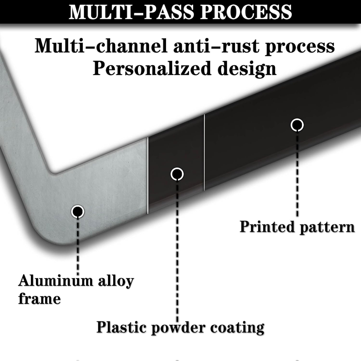 - ALUMINUM FRAME: This License Plate Frame is crafted from high-quality aluminum that is resistant to corrosion, rust, and harsh weather conditions. Its rugged reliability design ensures a long lifespan, making it capable of withstanding car washes and extreme weather, providing you with a reliable and stylish solution for your vehicle.